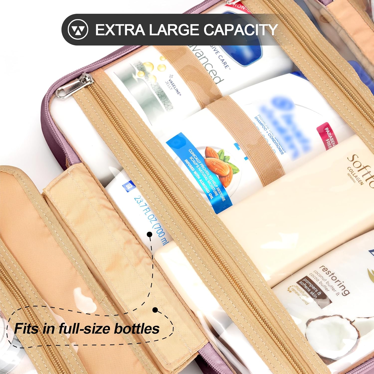 Travel Hanging Toiletry Bag for Women, Extra Large Makeup Bag, Holds Full-Size Shampoo, with Jewelry Organizer Compartment, Waterproof Cosmetic Bag, Toiletries Kit Set with Trolley Belt, Dark Purple