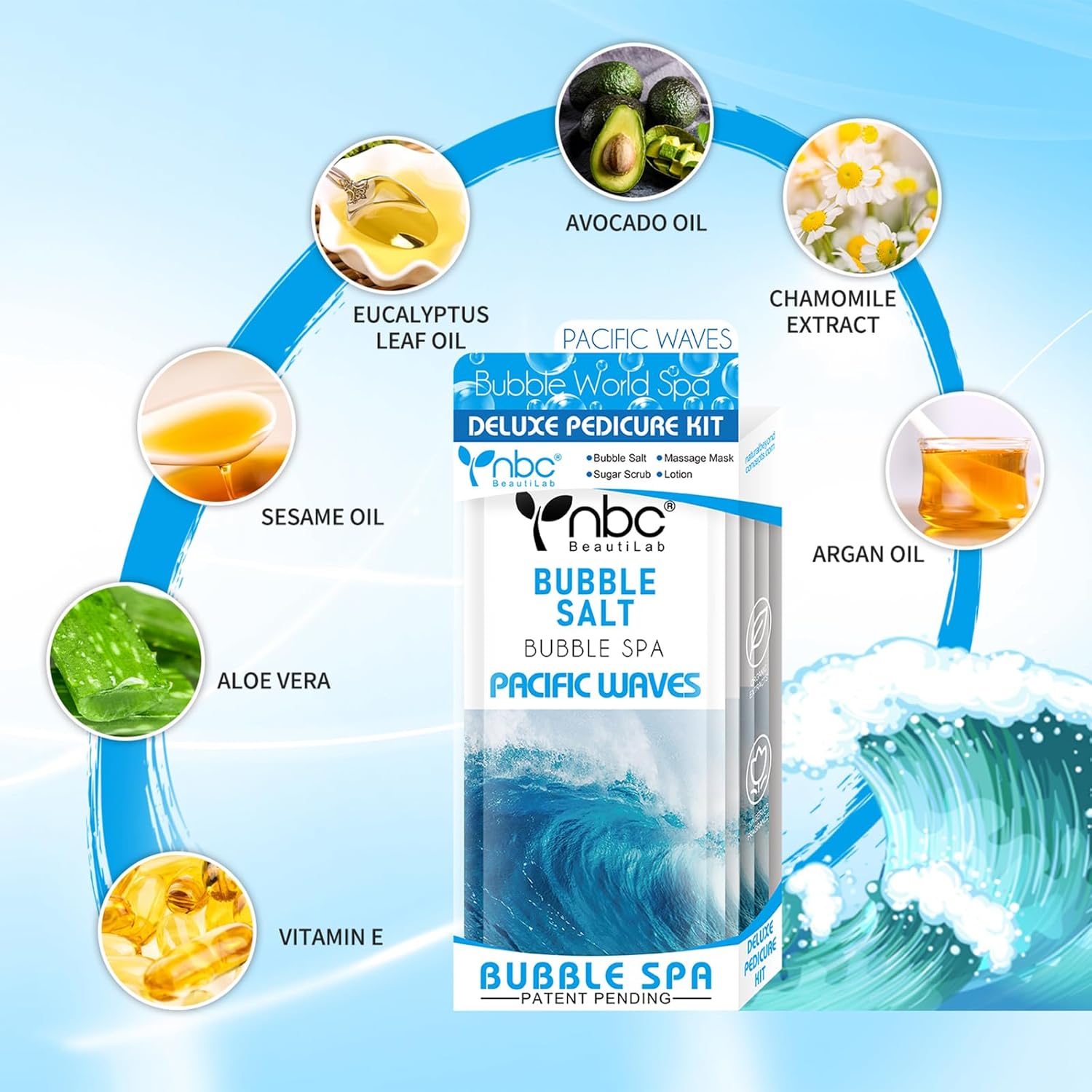 Pedicure Kit Foot Soak Set: Bubble Salt, Sugar Scrub, Massage Mask, Massage Lotion in a Box, 4 Step Foot Spa Kit for Dry Feet, Calluses and Tired Feet(3 Set Pacific Waves)
