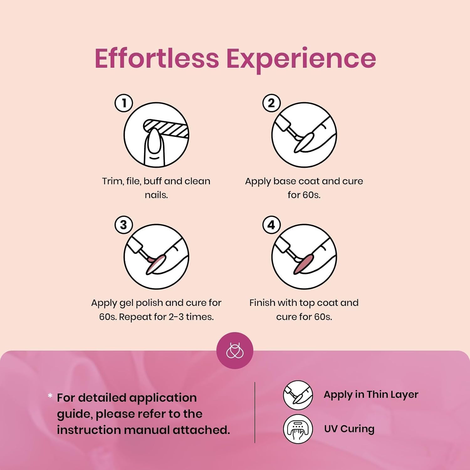 - Speed Curing with LED Nail Lamp: The gel nail polish set needs to be cured under an LED Dryer Lamp. Base and Top coat required. Average for an LED Lamp is 60-120 secs.