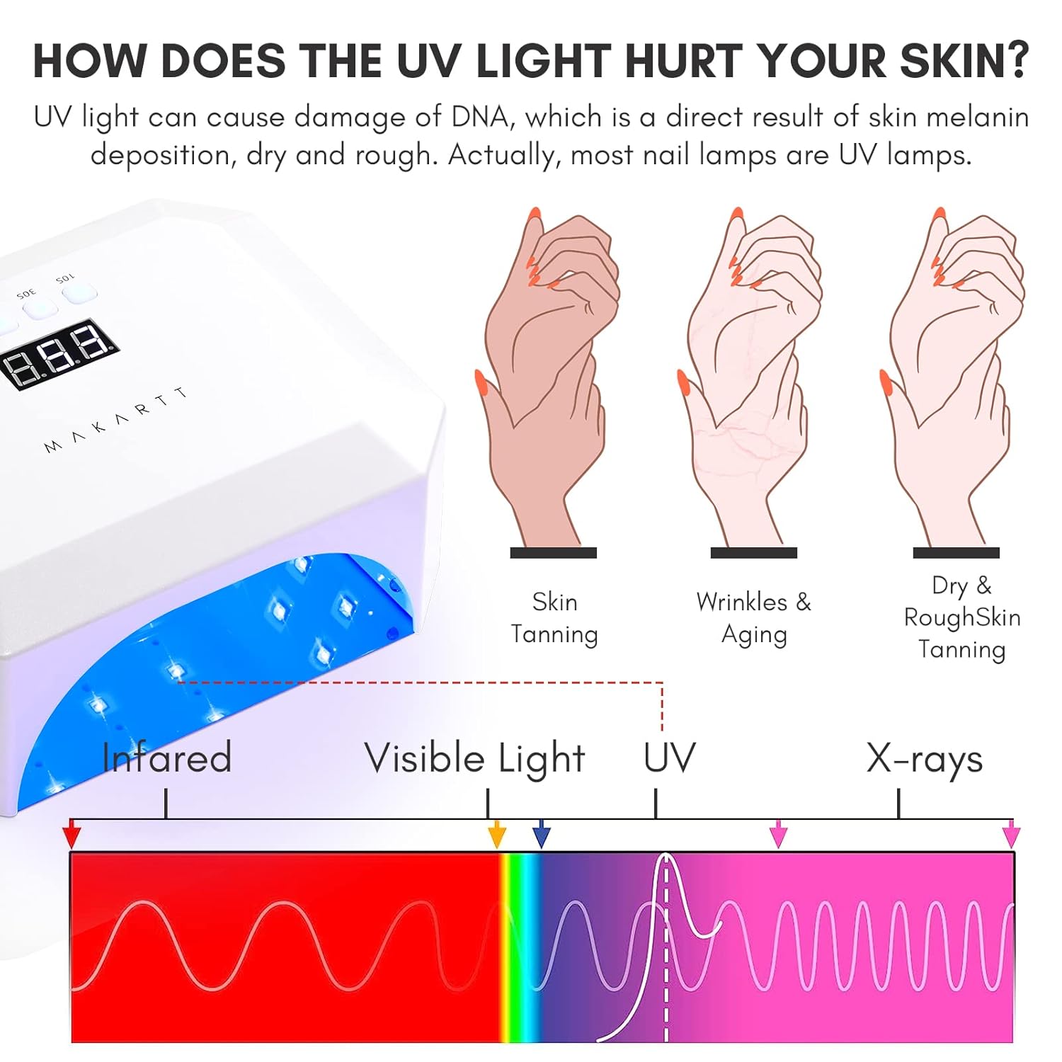 - Why Makartt UV Nail Gloves? As we know, human DNA will be damaged if exposure on UV light long time, which is a direct result of skin tanning, drying and aging. And Most nail nail lights are UV lamps. Frequent use of nail lamps without protective measures will make your hand skin dark, dry, rough and aging. It is necessary to protect your hand if you are a nail art lover and using nail lamp frequently.