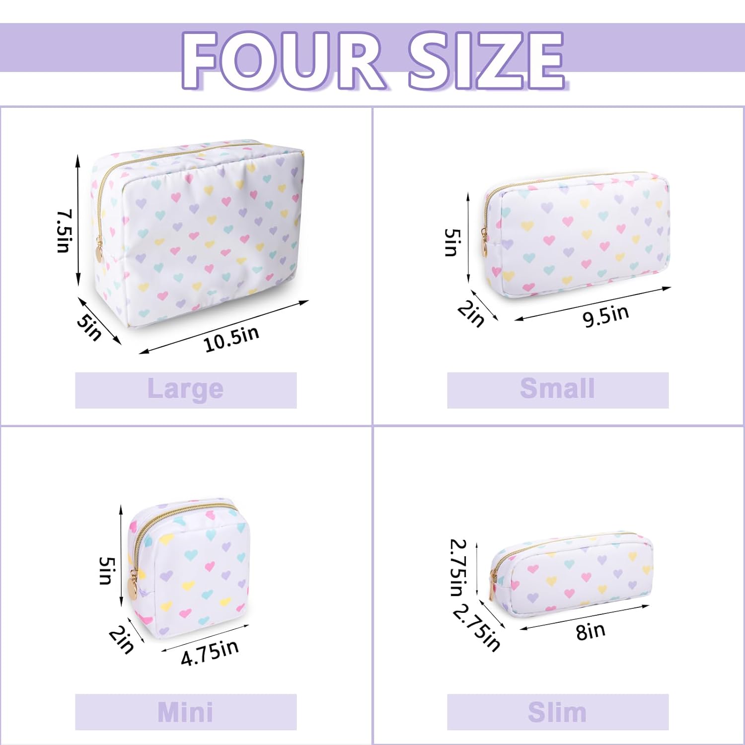 • 【Multiple Options】The waterproof makeup bag has four sizes, Mini(4.75''*2''*5''), Small(9.5''*2''*5''), Large(11''*5''*8'') and Slim(2.75*8''*2.75''). You can choose the right size according to the items you want to store. We have four types of patterns, Pink Heart, Houndstooth, Checkerboard grid and White Heart. You can enjoy choosing the pattern you like.