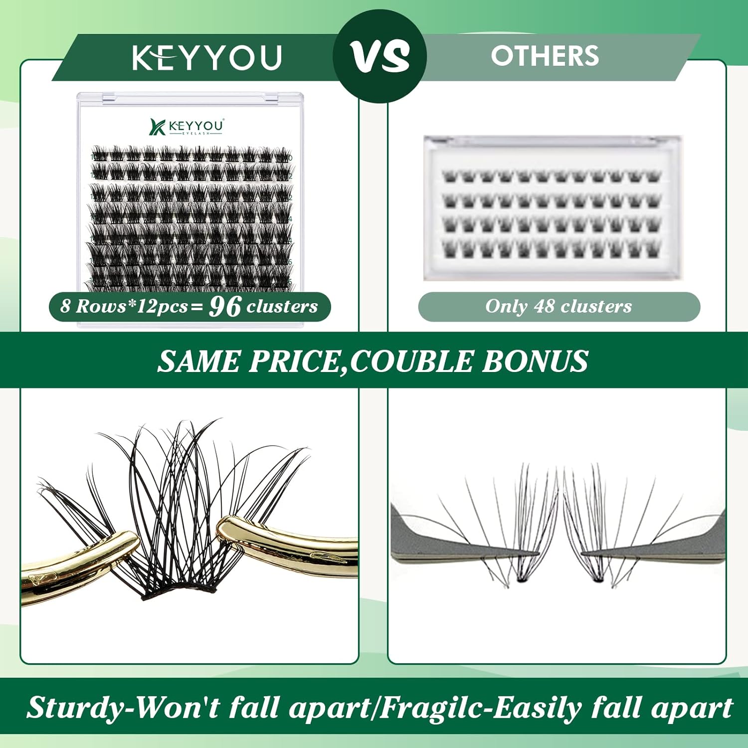 - 【Soft&Comfortable】KEYYOU lash cluster are made of imported materials,the stem line is thinner and softer, the eyelash cluster are lighter and more comfortable to wear.96 clusters in one tray ,more cost-effective.