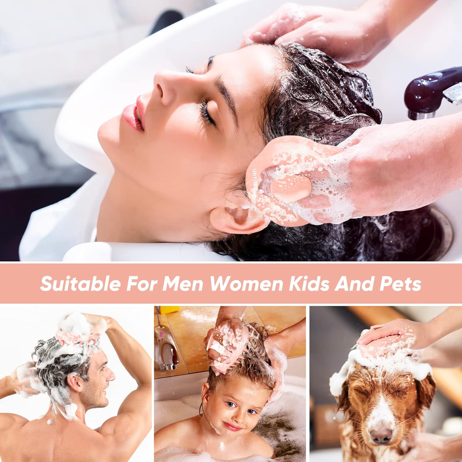 URTHEONE Scalp Massager Shampoo Brush, Hair Scalp Scrubber Head Massager with Soft Silicone Bristles for Women Men Kids Pets Shower and Hair Growth(Pink) Includes 5 Pcs Hair Ties