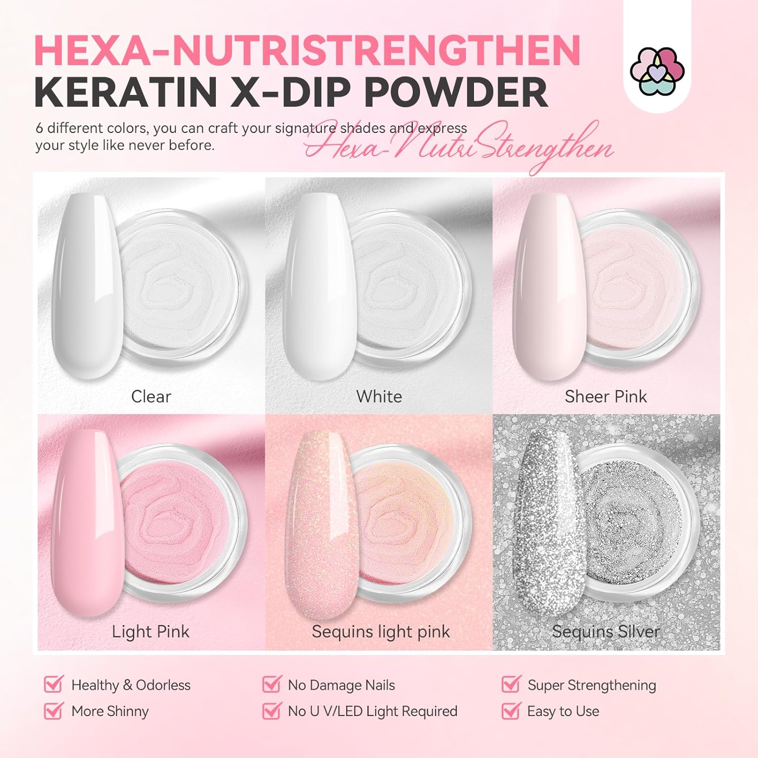 - Hexa-NutriStrengthen Dip Powder Nail Kit with Nail Drill: SSProDip X Nails Dip Powder Kit contains 6 colors of dip powder, nail drill kit, dip base, dip top, activator, nail file, nail dust brush, dip powder recycling tray and replacement brushes. With 6 popular colors, you can have a beautiful nail style with simple operation and make you shine in any occasion