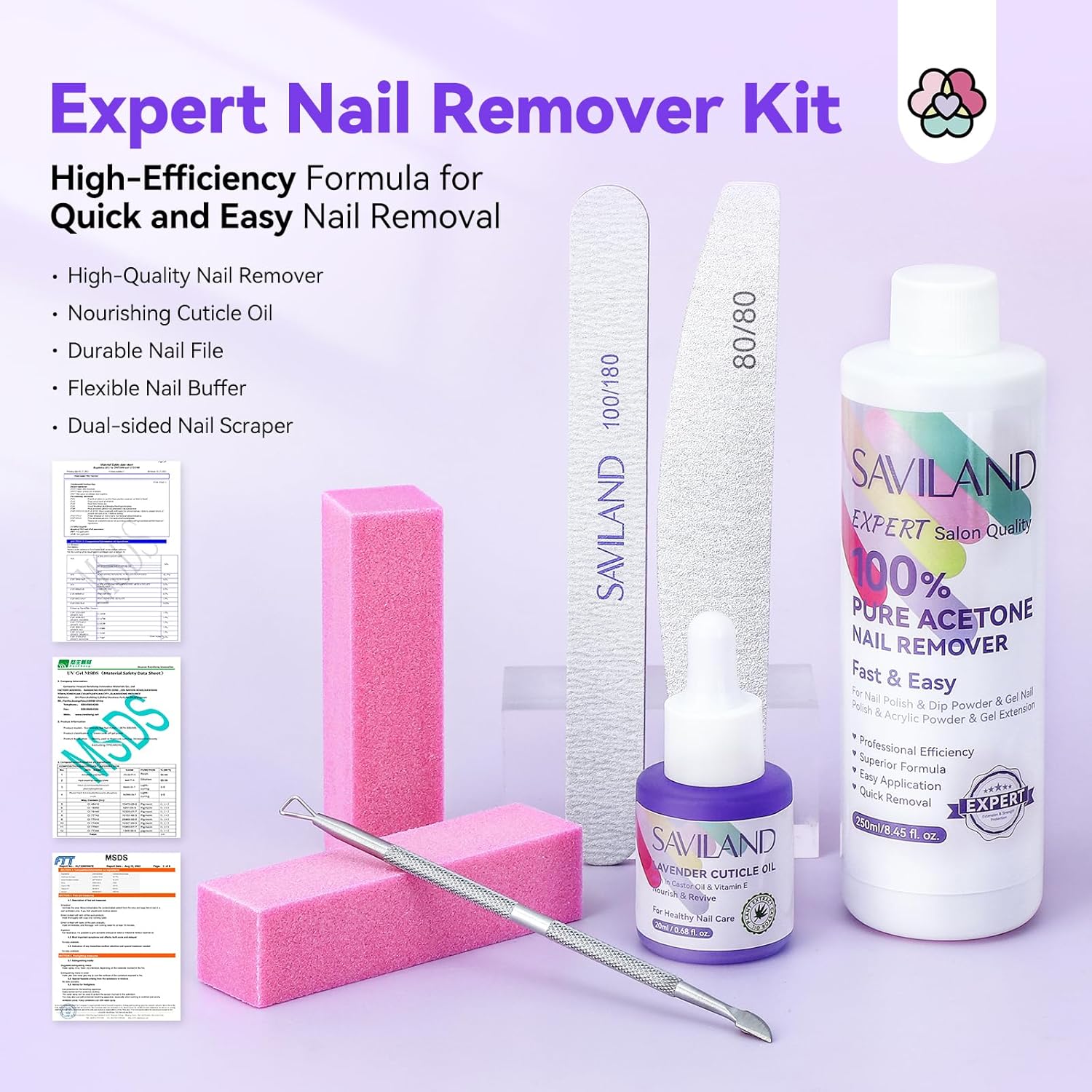 - All-in-1 Nail Care: SAVILAND 100% Acetone Nail Polish Remover is specially formulated to quickly and effectively remove various types of nail polish while protecting your nails from damage. The kit includes user-friendly tools, including a deep-cleansing nail polish remover and a richly nourishing cuticle oil, designed to deliver instant hydration and promote healthy nail care