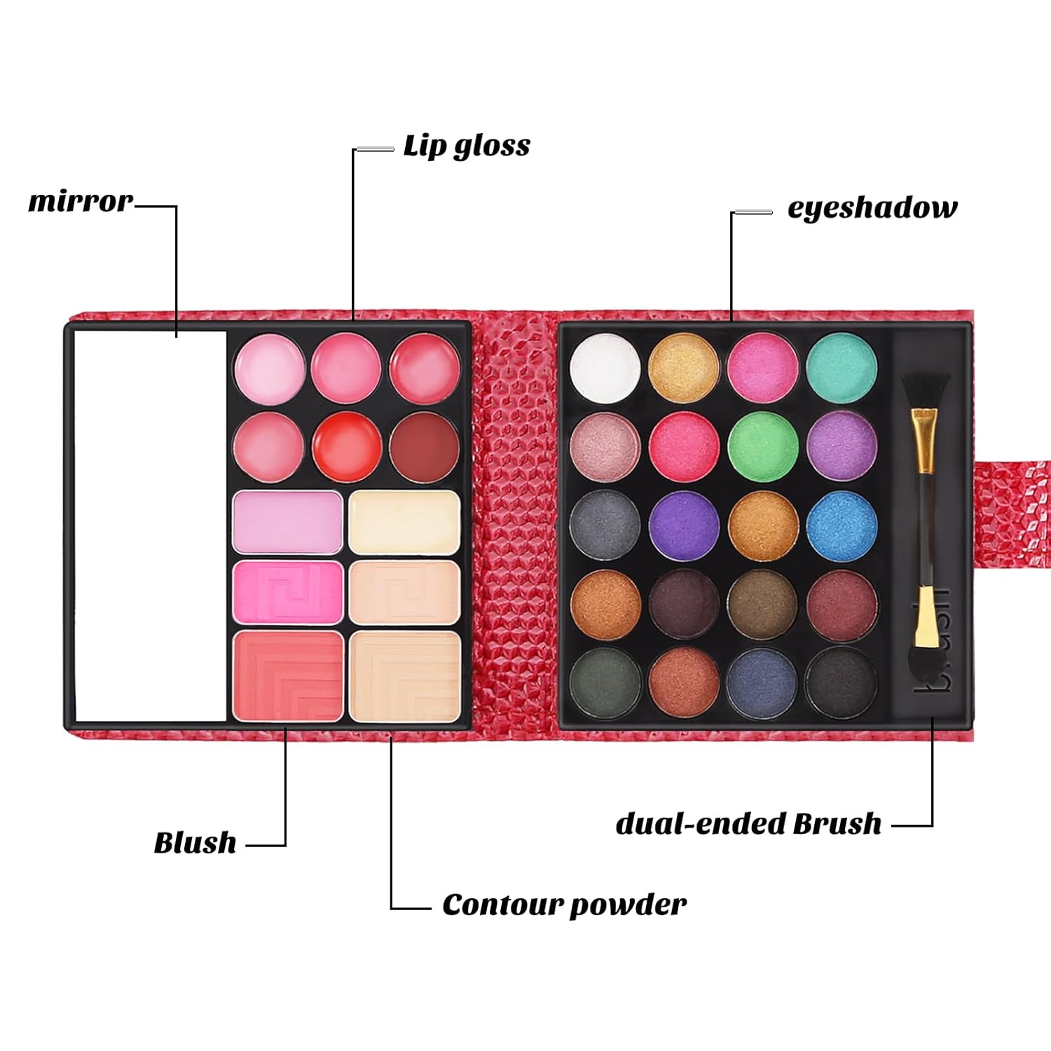 - Includes: 20-color eyeshadow palette, 3-color blush, 6-color lipstick and 3-color touch-up. The multifunctional palette gives various color matches for eyeshadow and contours the face for a defined finish.