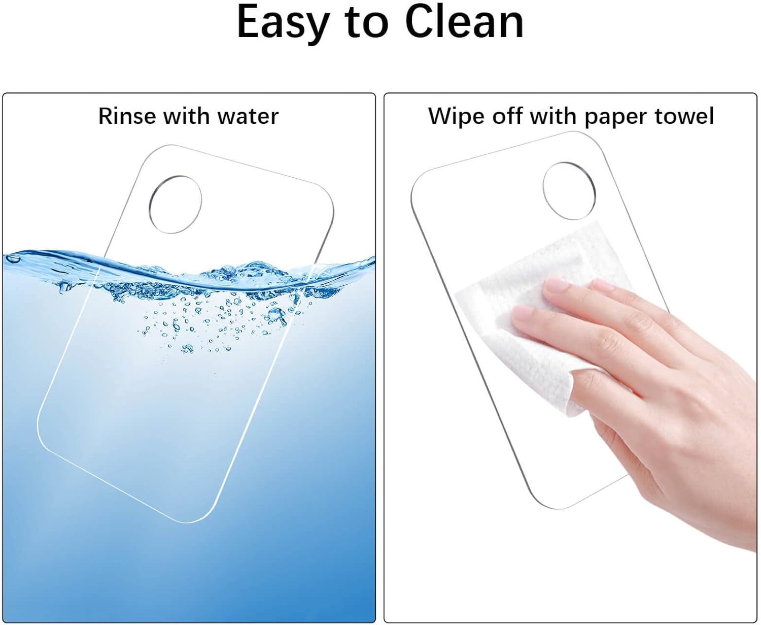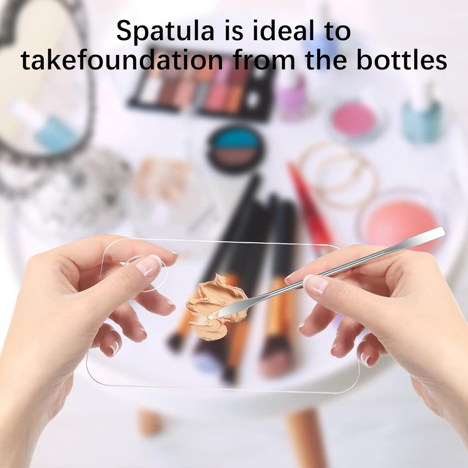 - Value set: 2pcs acrylic makeup mixing palettes and 2pcs stainless spatula, makeup mixing palette:15*10cm/5.9*3.9inch, makeup spatula:15cm/5.9inch. 2-ended spatula help get the product out of the container, more easily and sanitary, as well as avoid waste. Foundation mixing tray with a diameter of 1.0inch thumb hole for easy holding, not only keep hands clean during make-up but also reduce the possibility of your cosmetics getting dirty. Easy to carry and fit your makeup bag