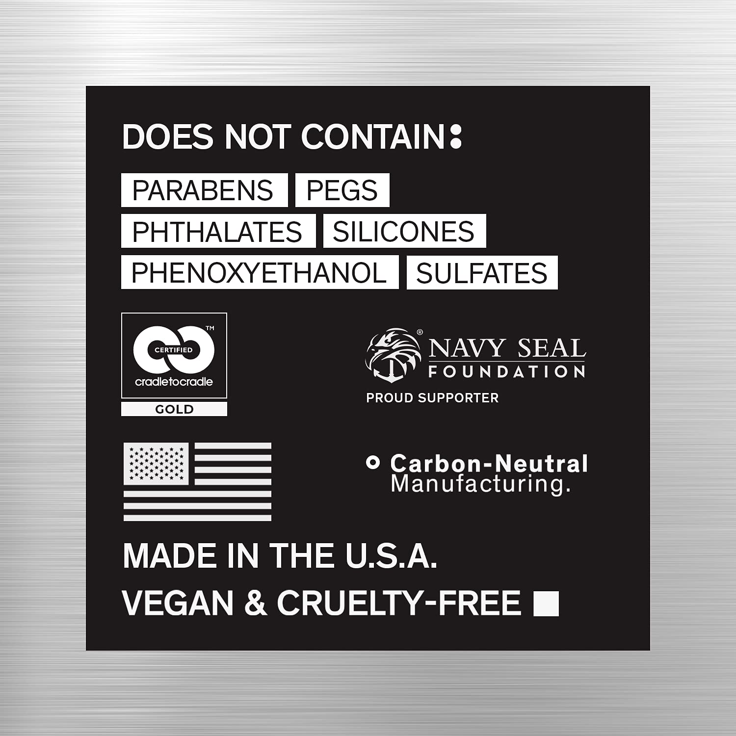 - Cradle to Cradle Bronze Certified: Does not contain parabens, phthalates, phenoxyethanol, silicones, sulfates, or PEGS. Vegan & Cruelty-Free. 99% biodegradable & carbon neutral manufacturing. Proud supporter of the Navy Seal Foundation. Made in the USA.