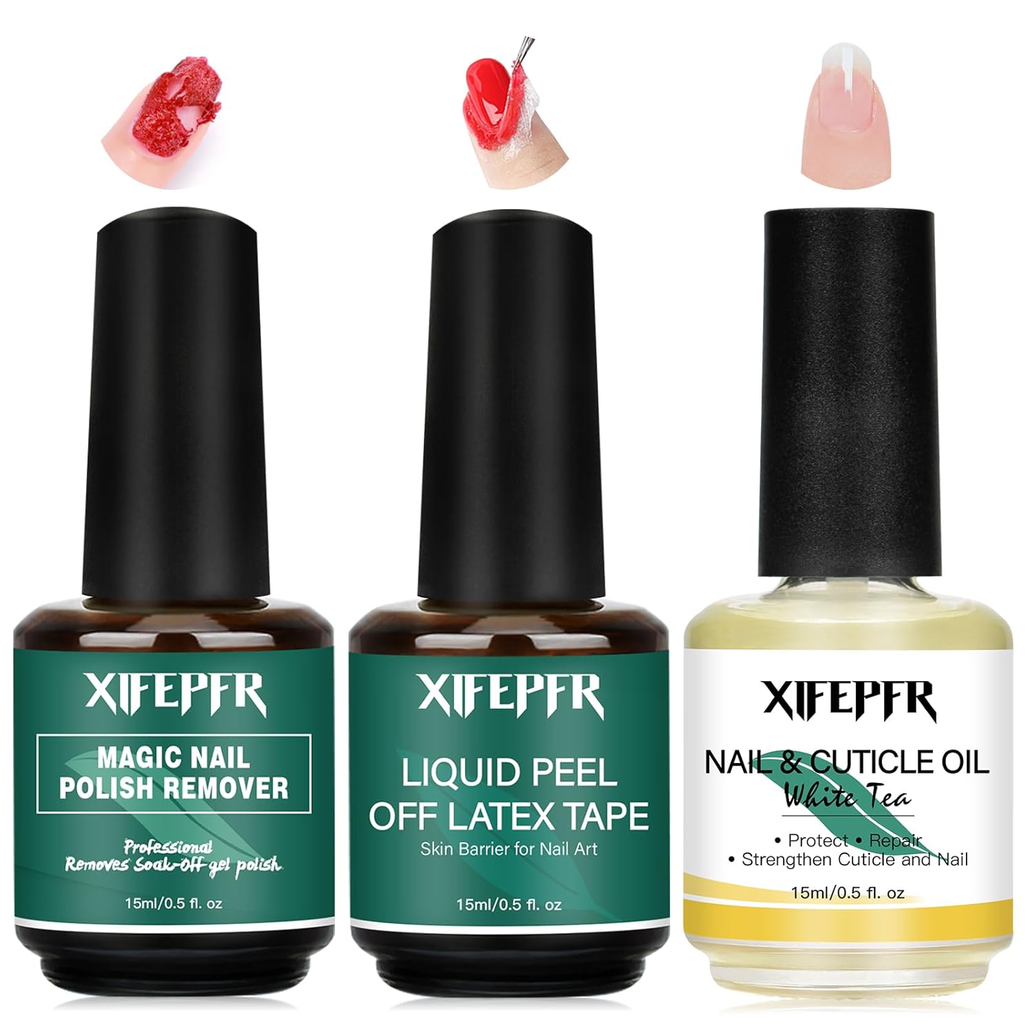- Gel Polish Remover Kit: Our kit includes 1pcs gel nail polish remover, 1pcs liquid latex for nails and 1pcs cuticle oil. 3-in-1 gel remover kit helps you quickly remove gel nail polish without damage nails, cuticle oil nourish and repair your nail cuticles, leaving your nails ready for the next manicure. Quick & easy gel polish remover set.