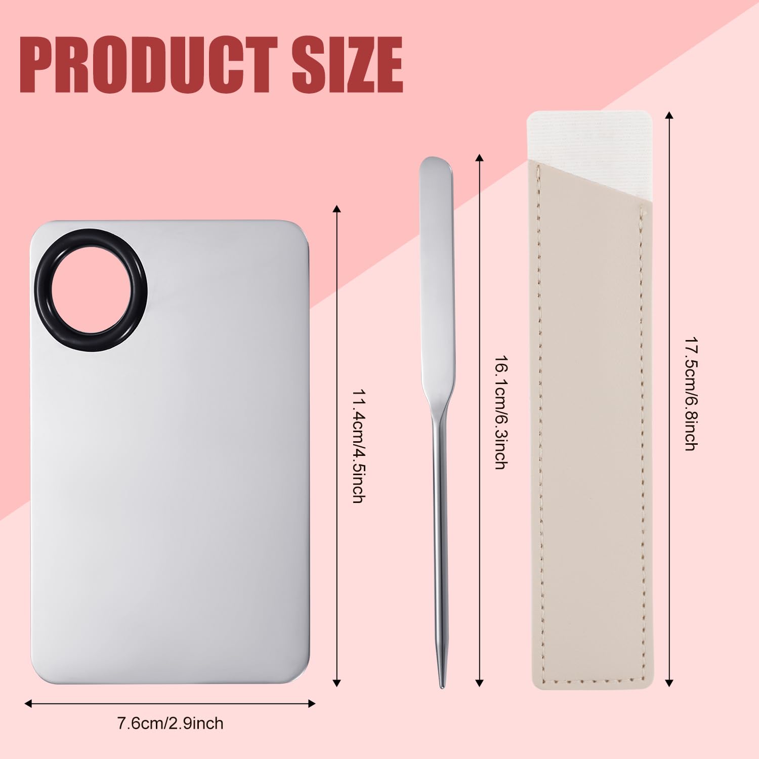 - Package content: You will receive 1 set of spatula makeup tools, including a palette with a size of about 11.5x7.6/4.5x2.9in; a spatula with a length of about 16.3cm/6.4in, and a scraper storage bag. The right size is convenient for you to take to travel without polluting your makeup bag.