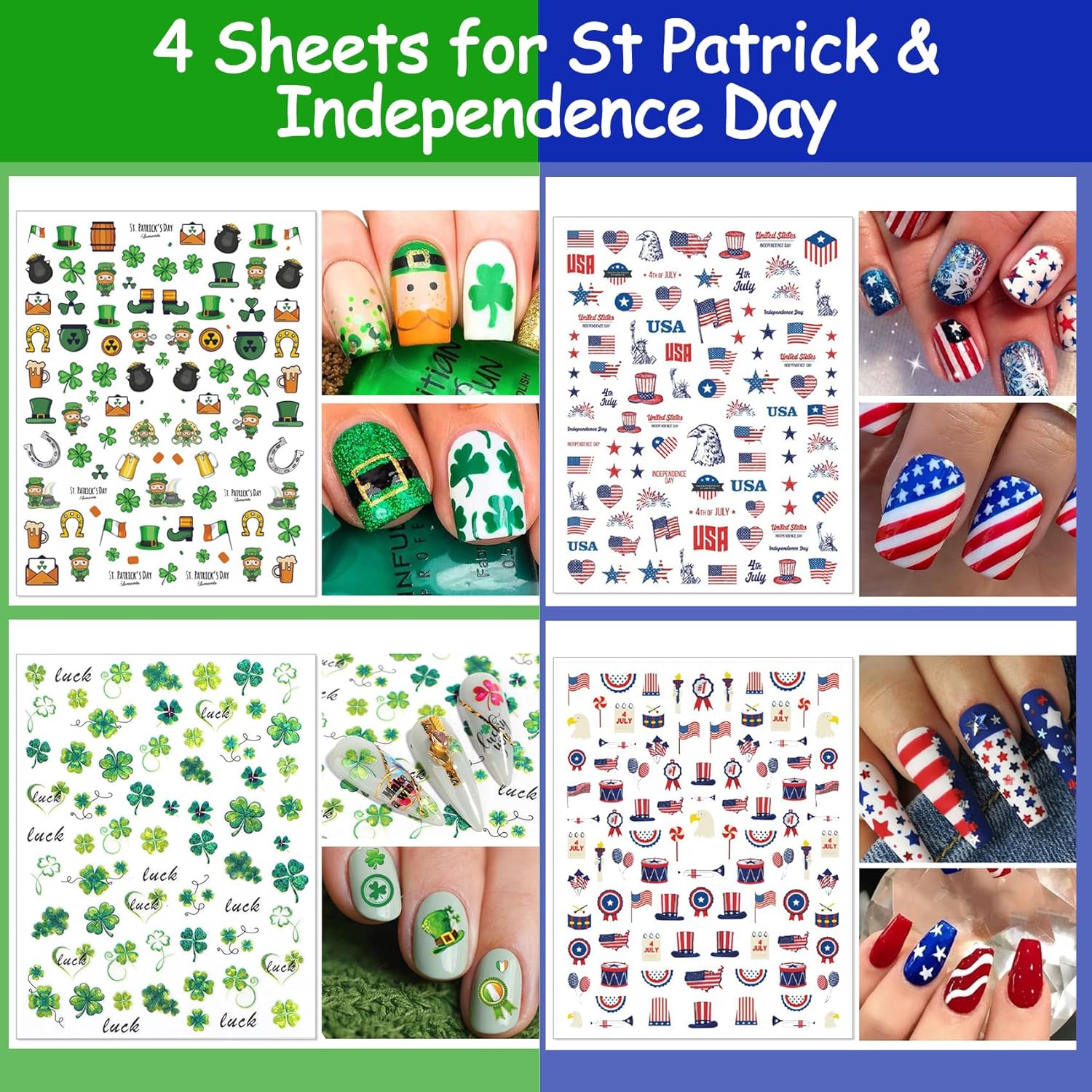 - A Set for All Year: You will get 20 sheets for all year round seasonal nail stickers for all holidays. 4 Sheets for each festival: Halloween, Christmas Thanksgiving Day, Valentine's Day, and 2 sheets for St. Patrick's Day and 2 sheets for 4th of July. Includes all sorts of seasonal classic theme: Pumpkins, Spider Web , Santa Claus, Snowflake, Maple leaves, Turkey, Love, heart, Shamrock, American Flag, USA etc. Make you have a special nail art all year round!