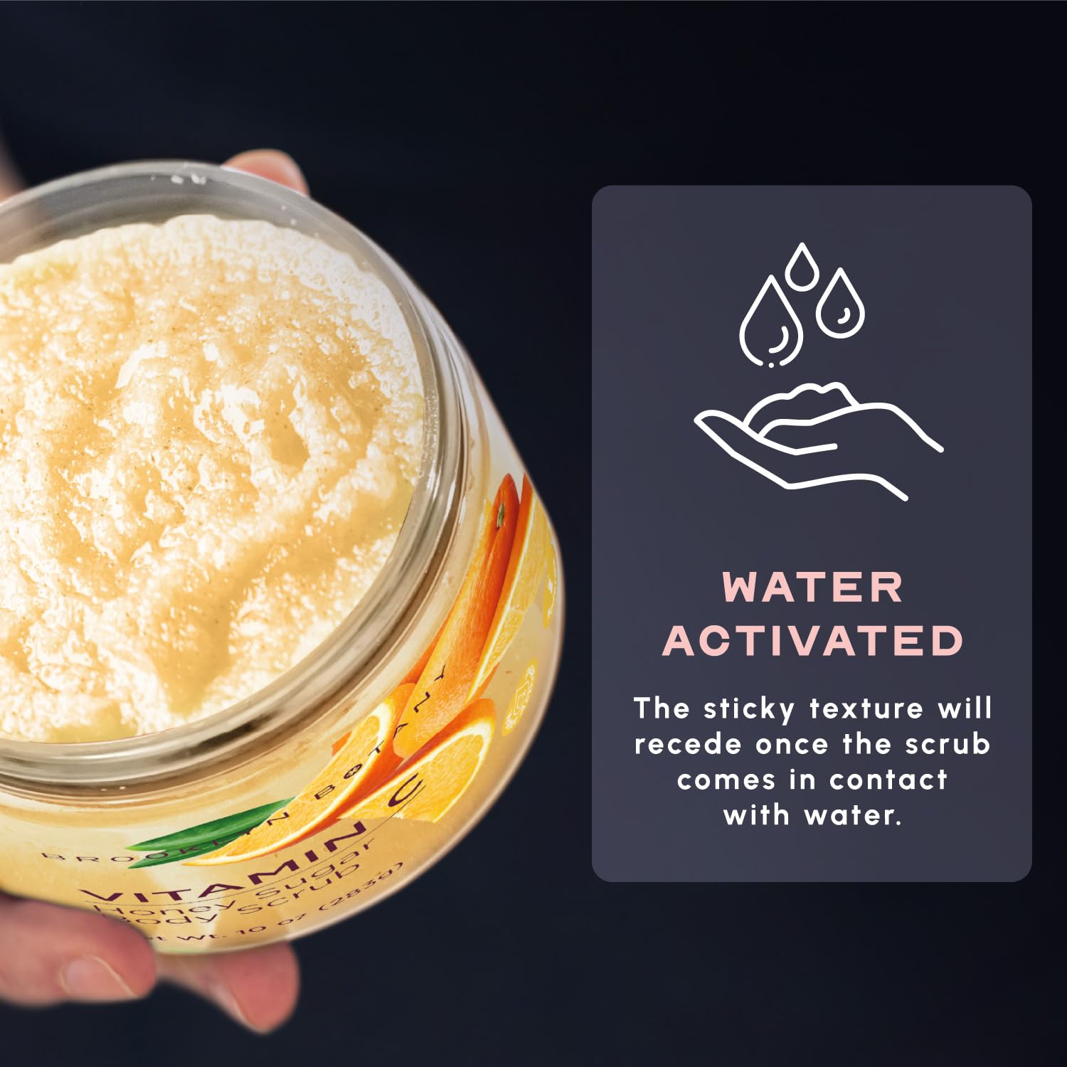 - WATER ACTIVATED – You will notice that the scrub has a sticky texture. Note that this is due to the presence of honey in the scrub and the stickiness will recede once it comes in contact with water.
