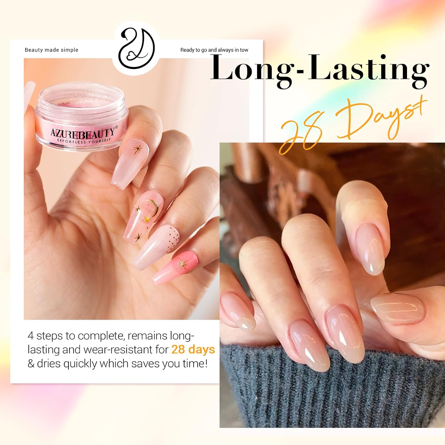 - 【No Need Nail Dryers & Easy to Use】Azurebeauty dip powder nail kit doesn't need a nail lamp to cure, dry faster, and be skin-friendly, which can avoid turning skin black and damaging nails. Create your beautiful nails with a 3-steps dip liquid set, an ideal choice for professional manicurists and nail beginners that enjoy the fun of DIY nails.