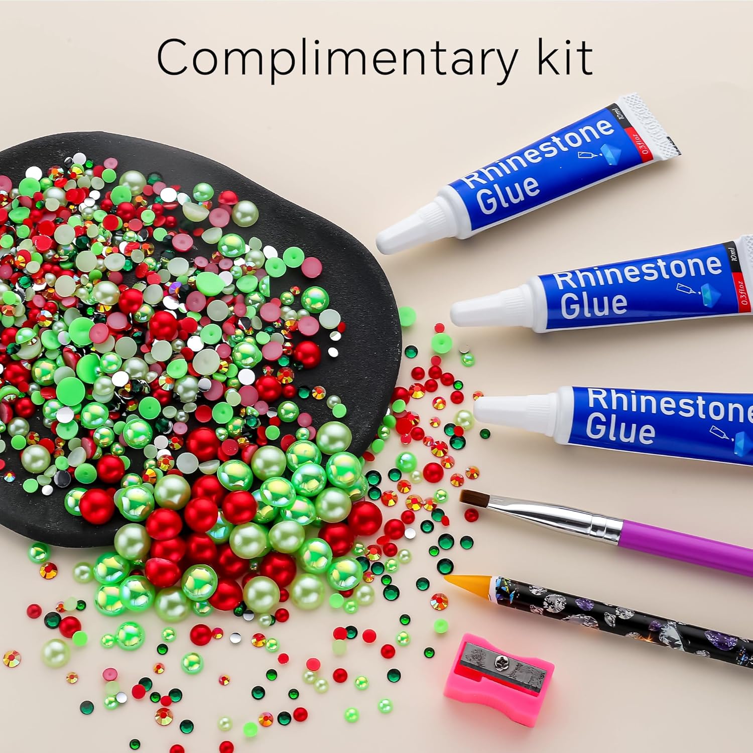 - What You Will Receive: 60g(30g*2)mixed size flat back christmas pearls and rhinestones. 3*Rhinestone Glue. 1* wax pencil for rhinestones. 1*Pencil sharpener(color random). The mix half round pearls and rhinestones can make more beautiful handicrafts for your friends, parents, yourselfs on any festivals.If you need a mixed size pack of pearl rhinestones