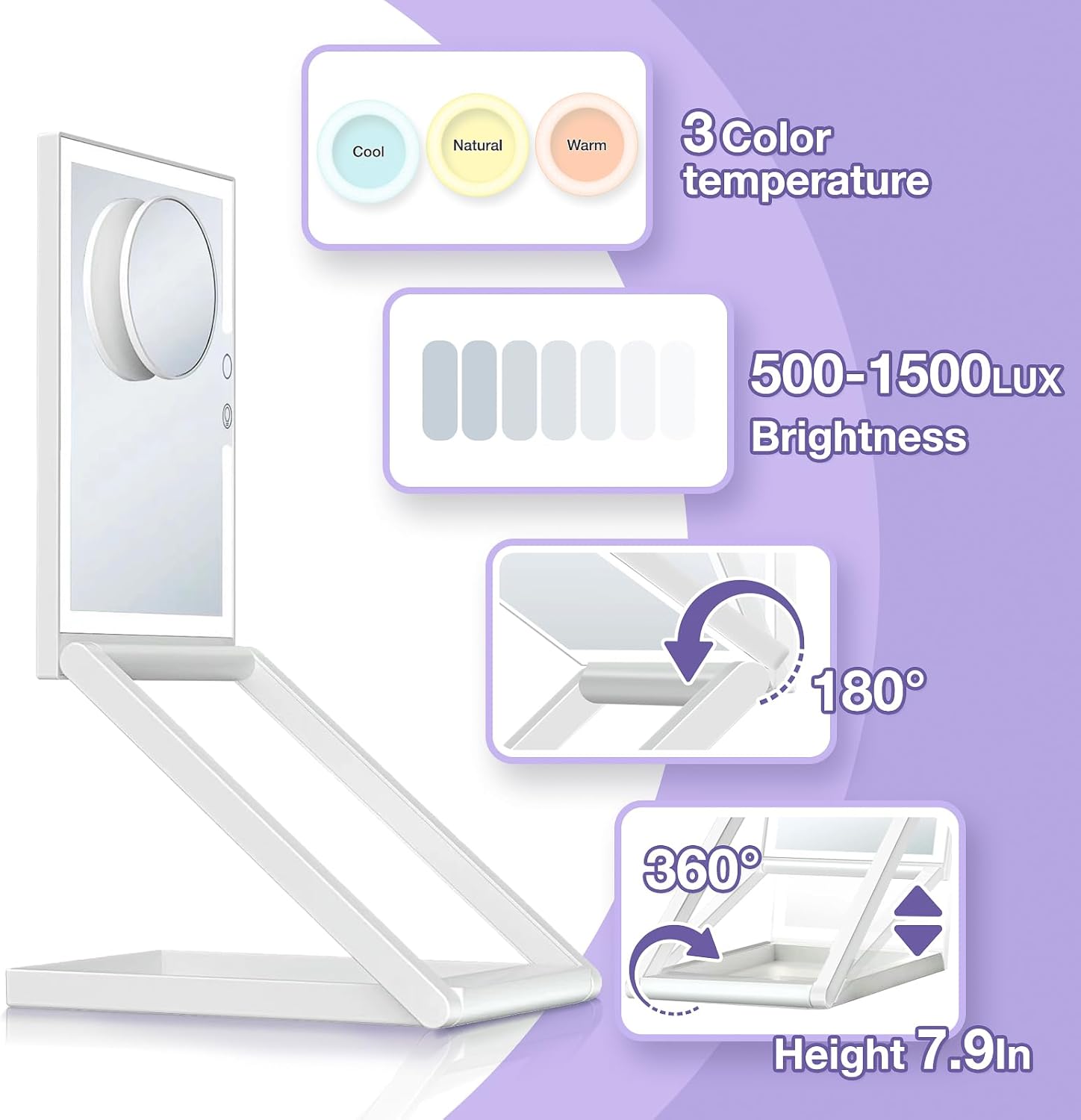 Travel Makeup Mirror with Lights - 3 Color LED, USB Rechargeable, 10X Magnifying, Adjustable Height, 360 Rotation, Compact Folding Touch Screen Smart Cosmetic Mirror