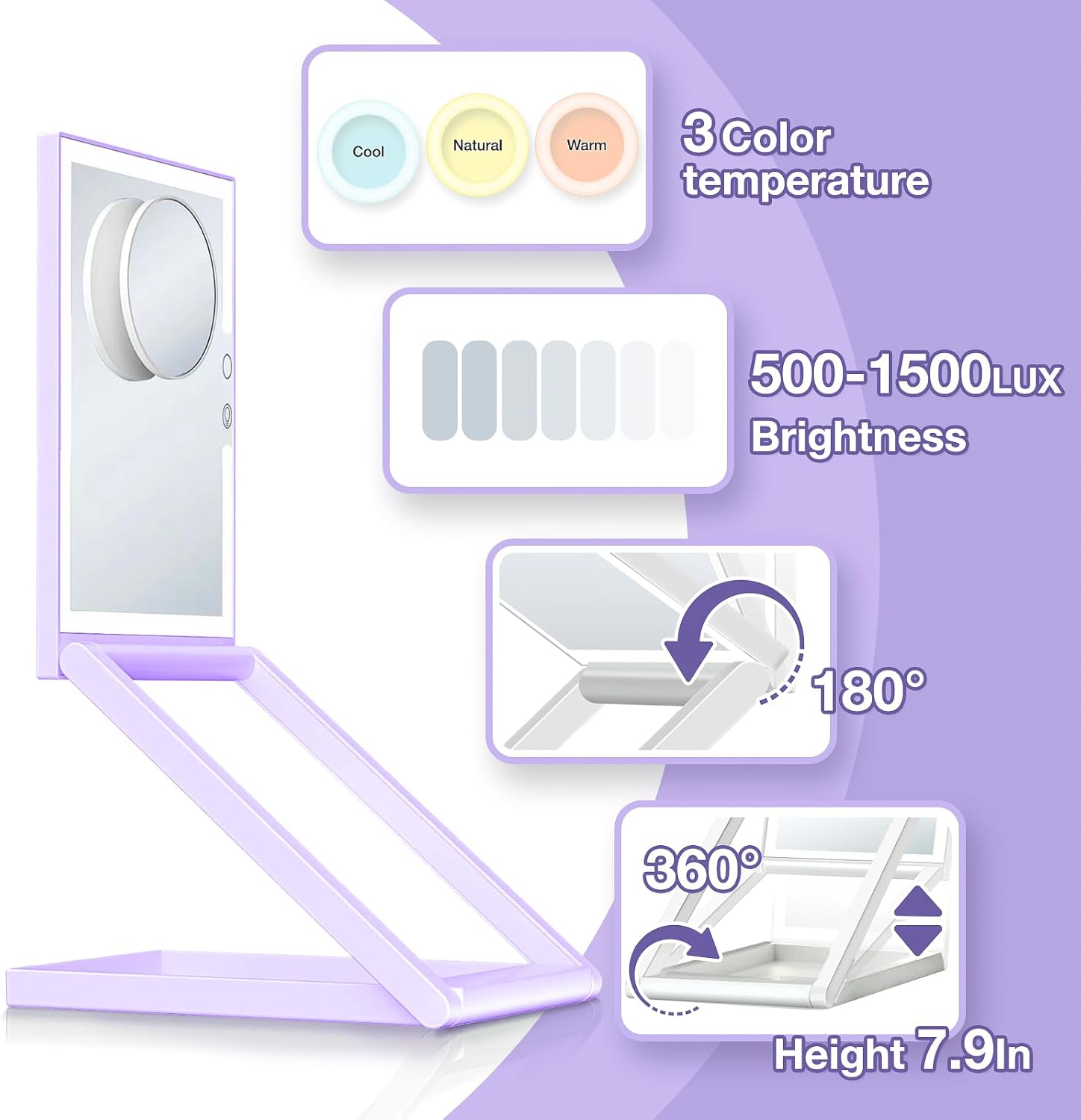 - VERSATILE HD PREMIUM TRAVEL LIGHTED MAKEUP MIRROR:This travel led mirror can switch to multi-angles to meet your various needs. The built-in light makes the mirror serve as a desk lamp, can be used as a bracket for mobile phones and a storage for personal cosmetics, it is more than a mirror.
