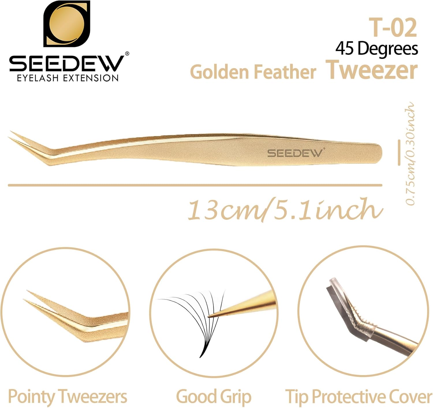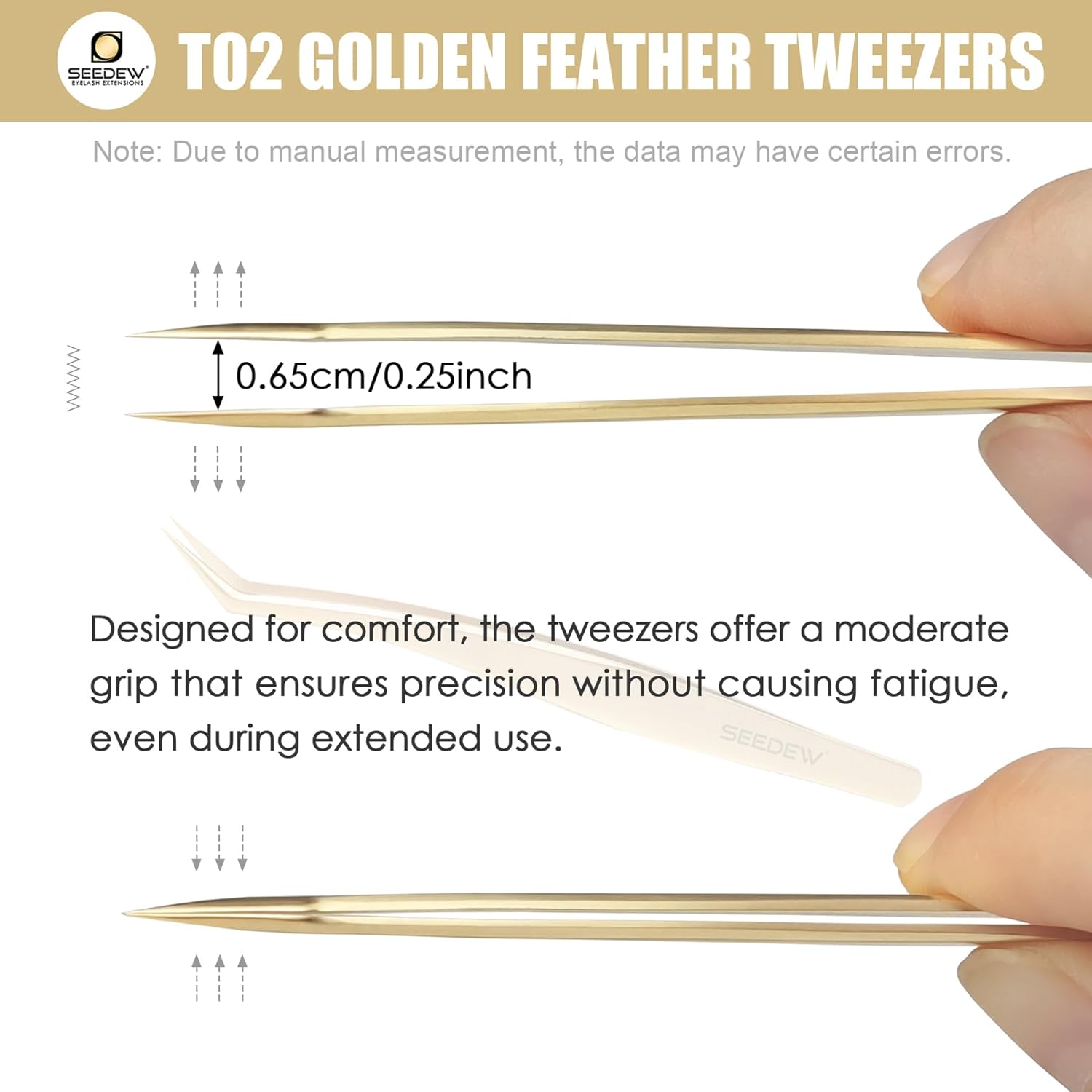 - đčăT02 Golden Feather TweezersăThe 45 degree Golden Feather Tweezers are the most popular style of tweezers that lots of eyelash artists like to use. They are mainly used for eyelashes blooming, or for picking up eyelashes for grafting.
