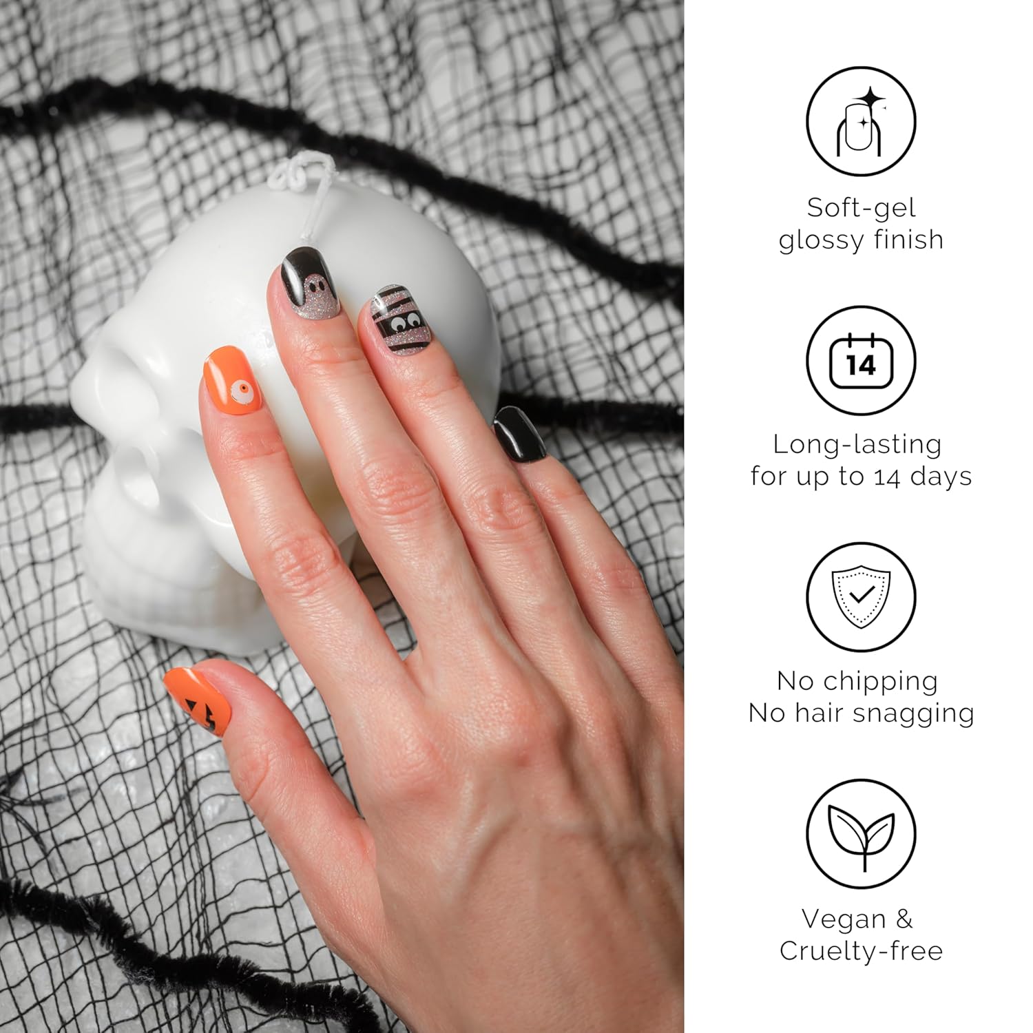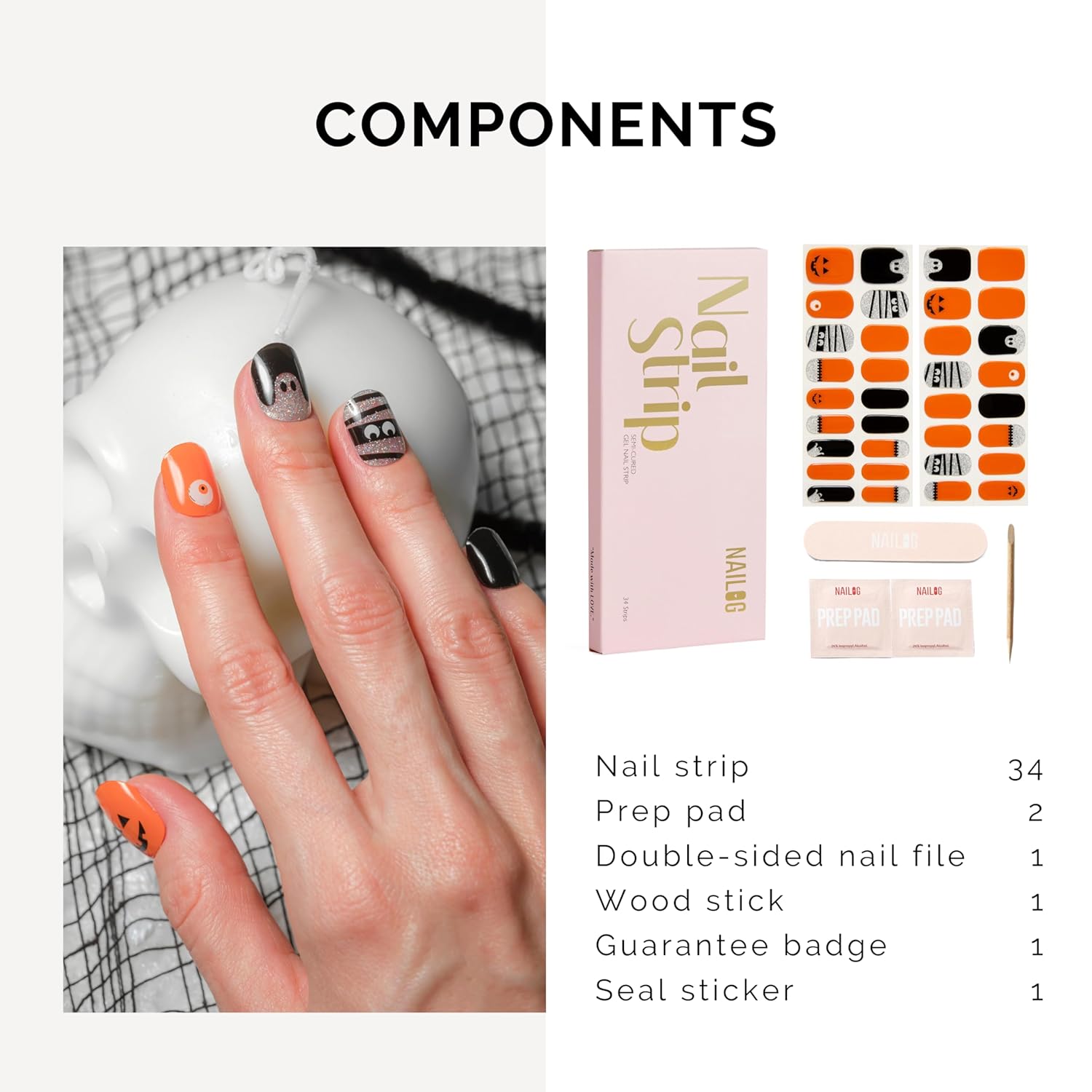 NAILOG Semi Cured Gel Nail Strips 34 pcs| Buy 2 Get 1 UV Lamp | Long Lasting Nail Polish Sticker Wraps with Glossy Gel Finish, Tricks or Treats