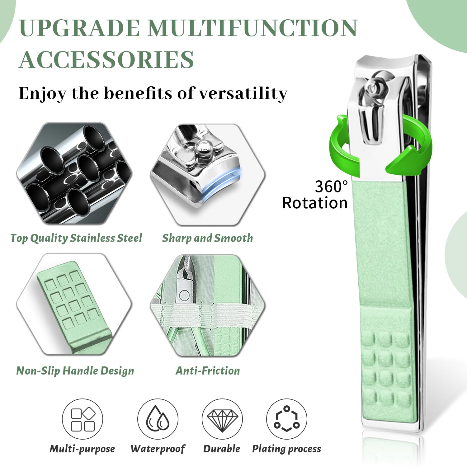 - Professional Nail Care Kit: Made of high-quality stainless steel, nail clippers are sharp and durable. Large, small, diagonal clippers can cut every corner of nails and trim thick/hard nails easily. The nail grooming kit is coated with an anti-rust green coating, which is pretty and practical, and also not easy to rust.