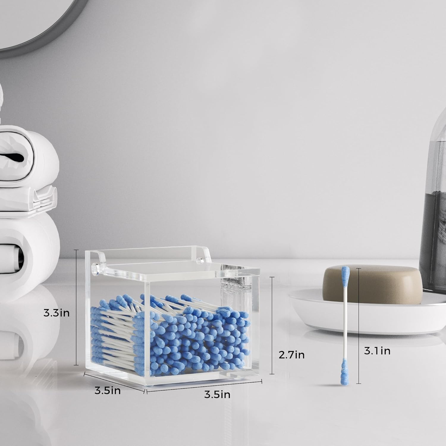 - Unique Design: This cotton square and qtip holder feature a dustproof lid to keep the items neat and clean. The crystal clear design makes it a stylish decor for your bedroom, bathroom, office, drawer, and dresser
