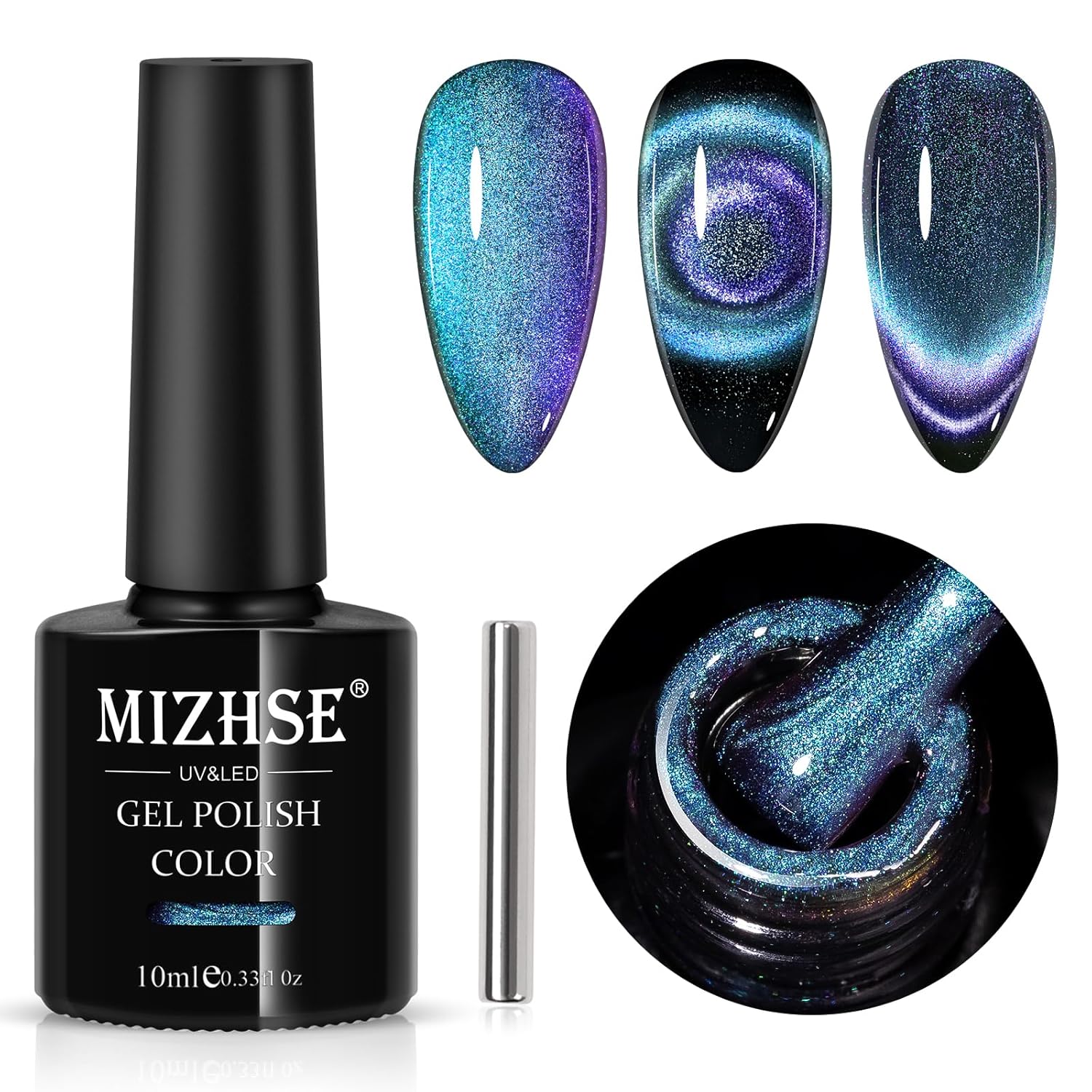 - MIZHSE 9D Cat Eye Gel Nail Polish: 1 color magnetic gel polish, 1 magnet stick, without black base. Save your money and time to nail salon! Enjoy the DIY fun of nail beauty at home. Suitable for natural nails, false nails, acrylic nails, etc.