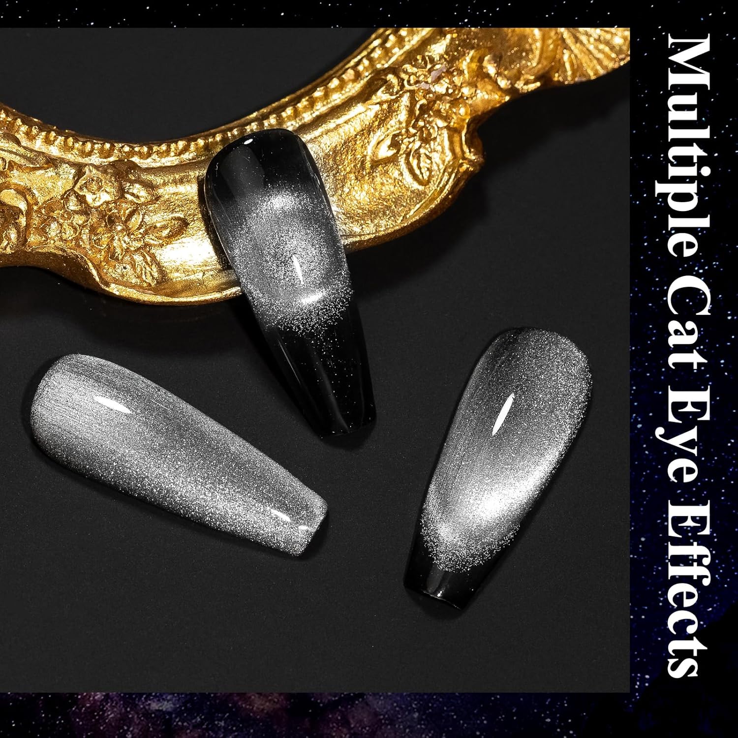 - Magic Galaxy Effect on Nails: Chameleon colors cat eye effect, and holographic shimmer galaxy effect cateye nail gel brings you an amazing 9D cat eye effect on nails, to feel the gradient colors under different lights or angles.