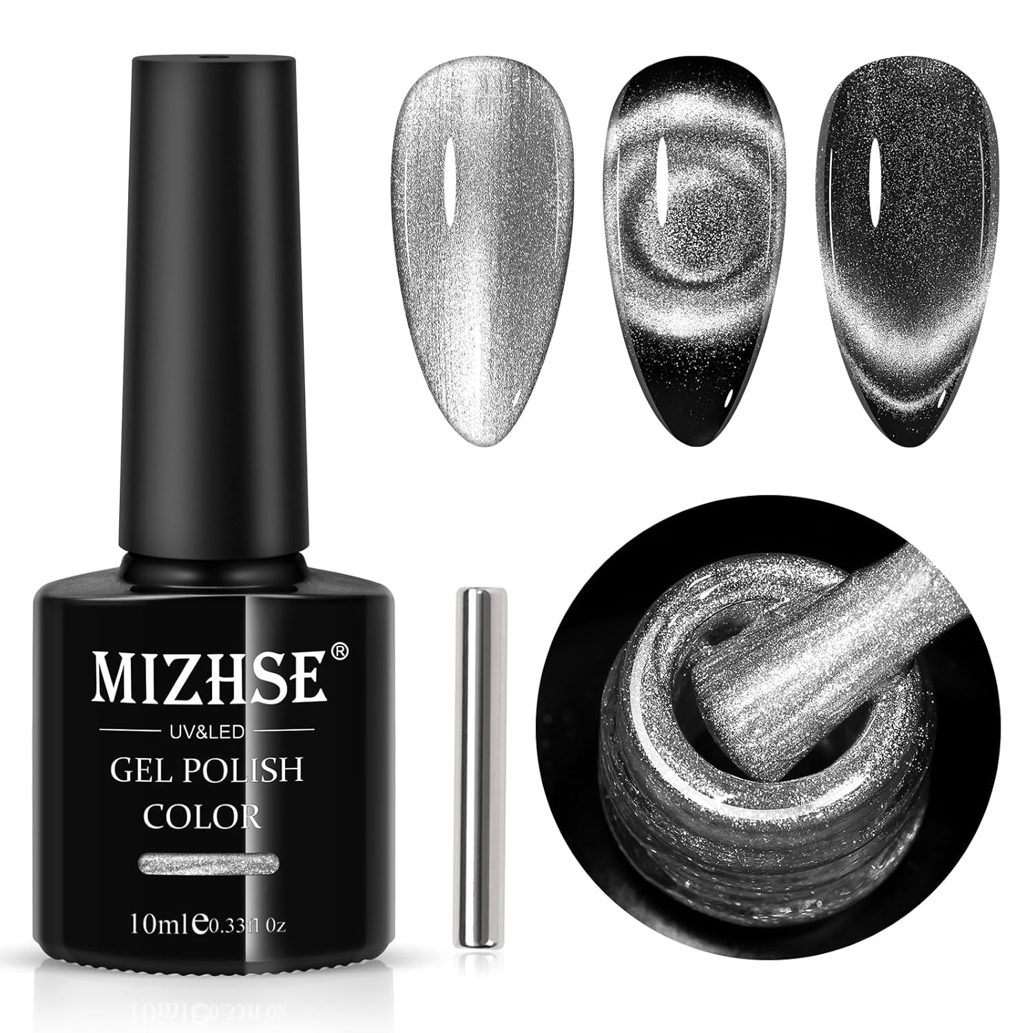 - MIZHSE 9D Cat Eye Gel Nail Polish: 1 color magnetic gel polish, 1 magnet stick, without black base. Save your money and time to nail salon! Enjoy the DIY fun of nail beauty at home. Suitable for natural nails, false nails, acrylic nails, etc.