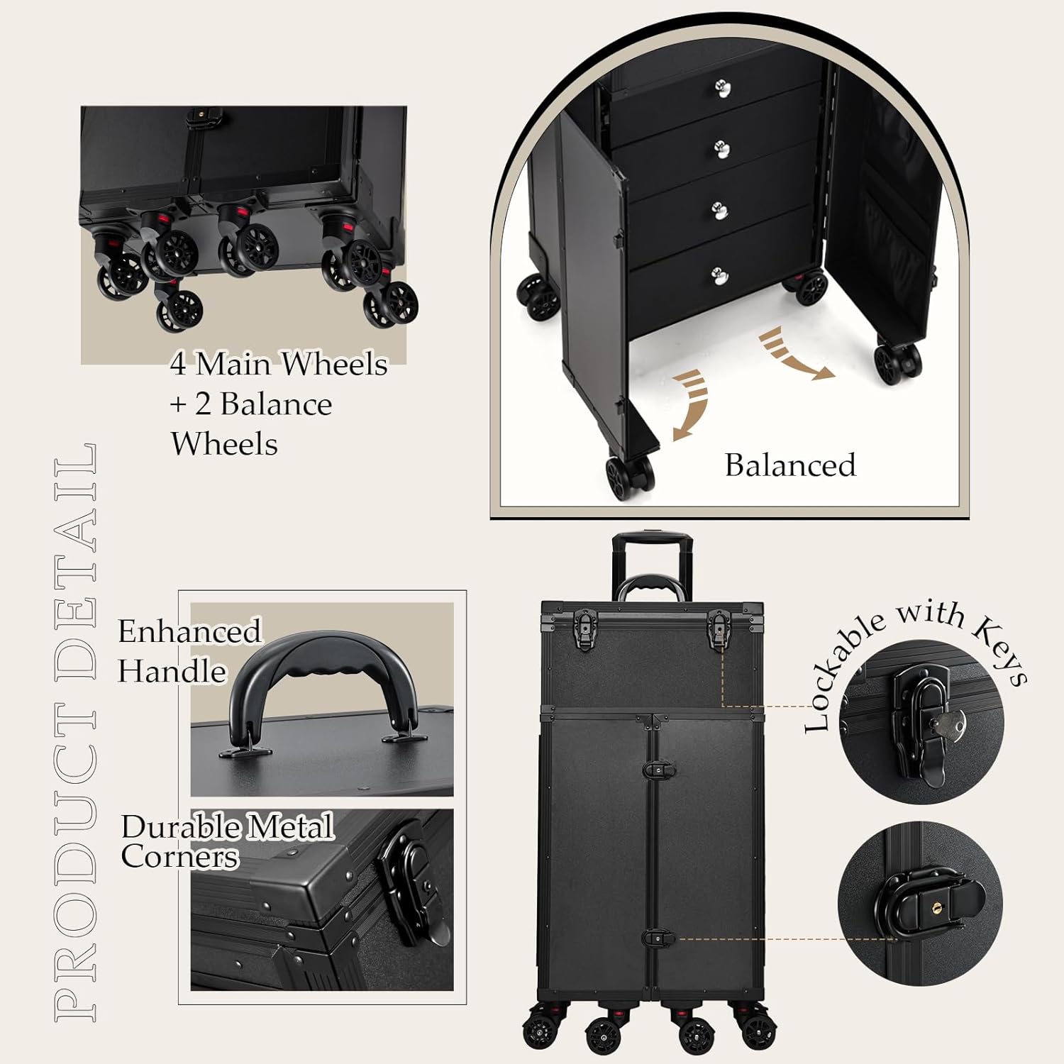 - Convertible Makeup Station: This makeup rolling case is a Convertible Makeup Station, the ultimate answer to your cosmetic needs. With 2 sliding flat trays for a temporary worktop, 4 large drawers set transformed into shelves, and 2 side doors providing steady balance, this makeup case is your versatile solution for seamless beauty sessions.