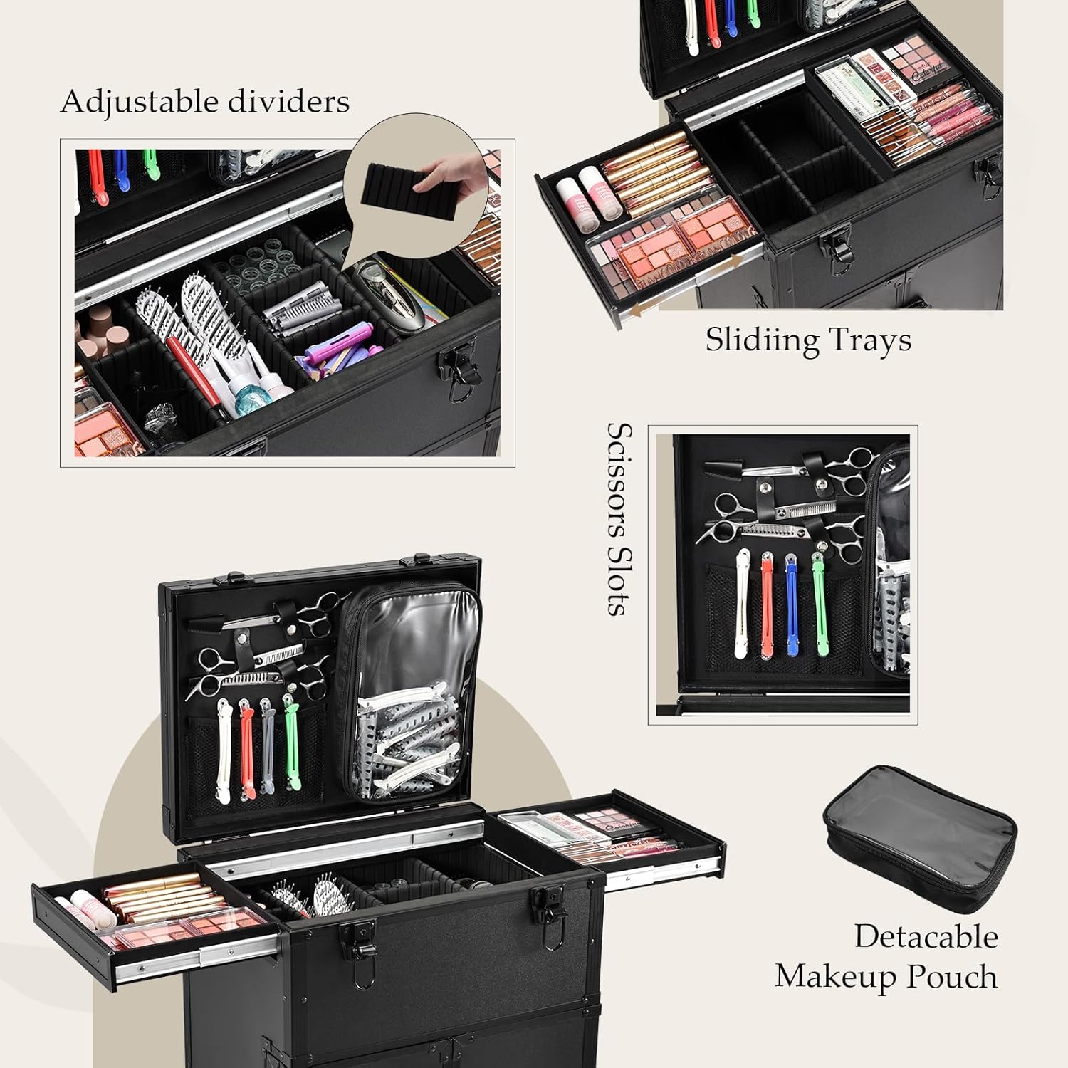 - Versatile Storage Compartments: The lid is equipped with scissor slots and a detachable pouch housing the accessories, the upper trays suits your flat palette collections or styling tools. Under the trays is an adjustable storage compartment which is perfect for nail polishes, lipsticks, brushes, or hair removers. In the lower part's 4-shelf drawer set holds, sprays, curling irons, hair dryers, or other supplies. While the side doors' pockets keep your mascaras, eyeliners, and combs accessible.