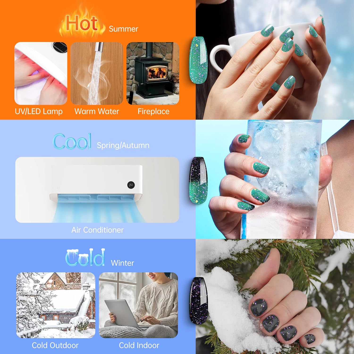 YTD Likomey Brocade Glitter Color Changing Gel Nail Polish,15ml Bright Green To Dark Green Shimmer Mood Temperature Change Colors,Fall Winter Ombre Thermal UV Nail Gel,WB349