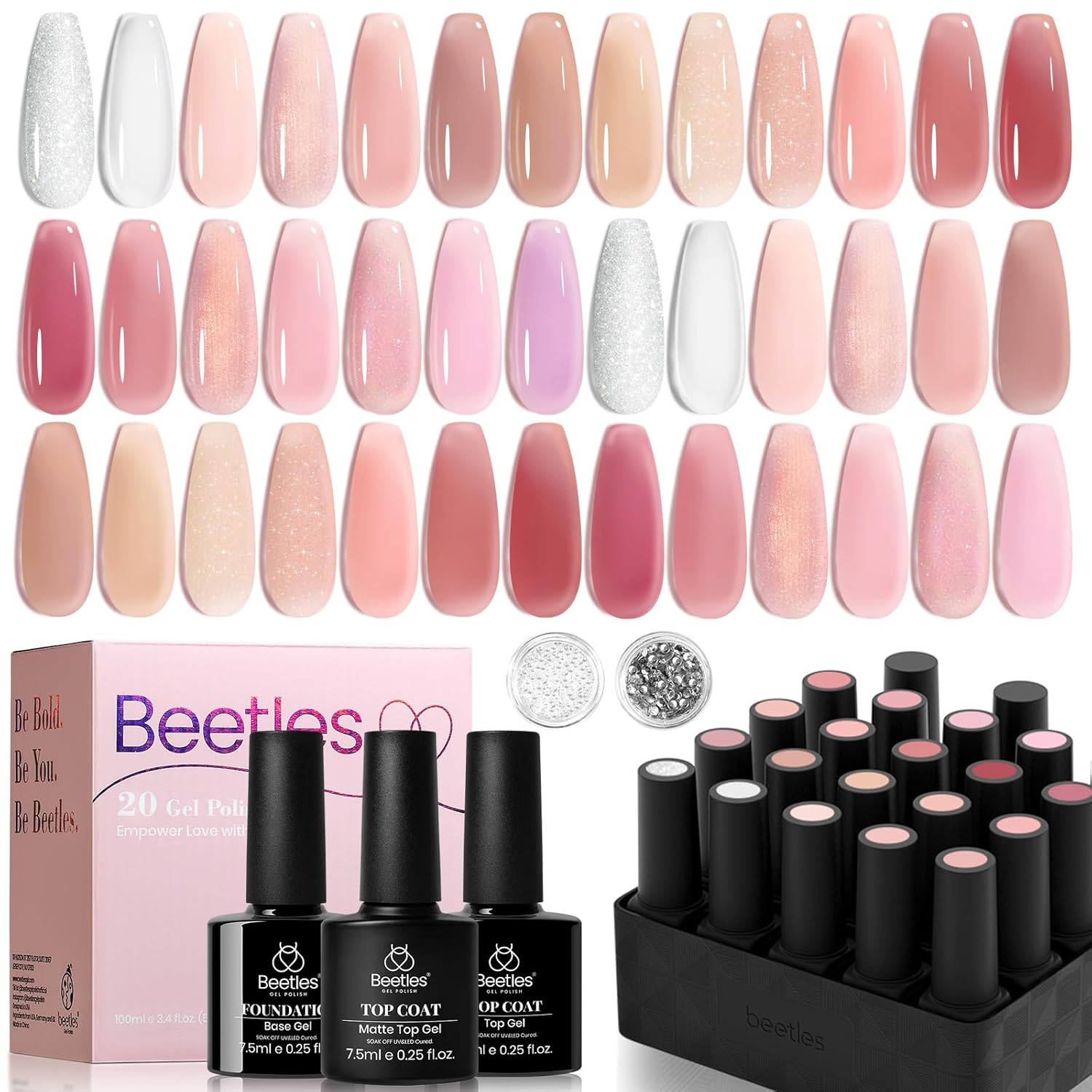 Beetles Nude Pink Gel Nail Polish Set, Nude Paradise Gel Polish Kit 25PCS 20 Colors Jelly Pink Sheer Glitter White Soak Off UV Base Glossy Matte Top Coat Pearls Rhinestones Nail Charms Gift for Women