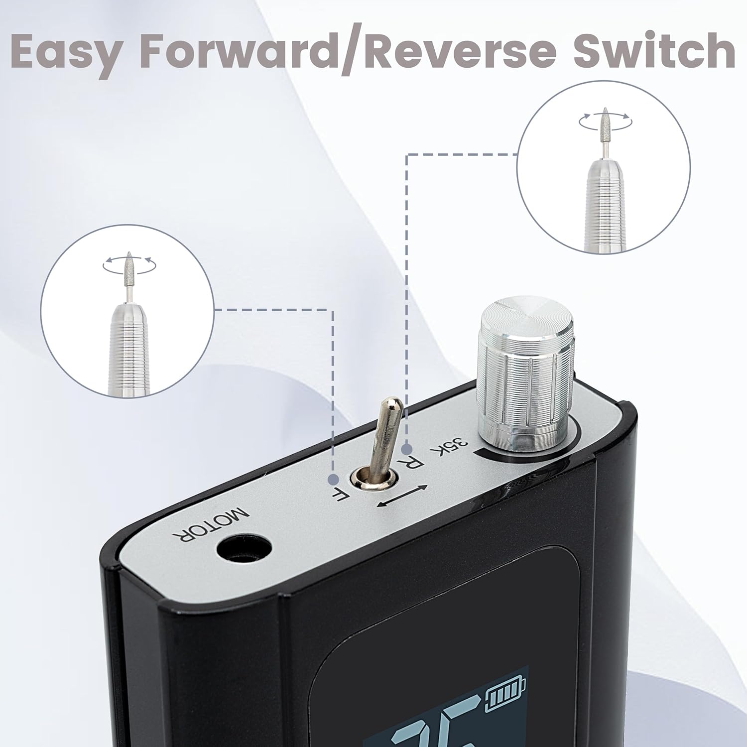 - Easy-to-Use: 2000mAh battery for up to 10 hours of continuous use on a single charge. Forward and reverse options for both left- and right-handed uses. The smart screen tells you information such as speeds, rotary directions, and remaining power