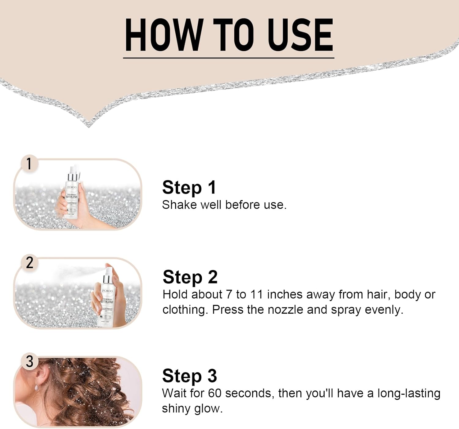 - Easy to Use: Shake well and evenly, hold the highlighter spray about 7-11 inches away from where you want the glitter to be, press the nozzle and spray evenly. Wait 60 seconds and then you'll have a long-lasting shimmering glow. Note: Silver glitter powder will precipitate at the bottom of the bottle after a long time, this is a normal phenomenon, shake well before use.