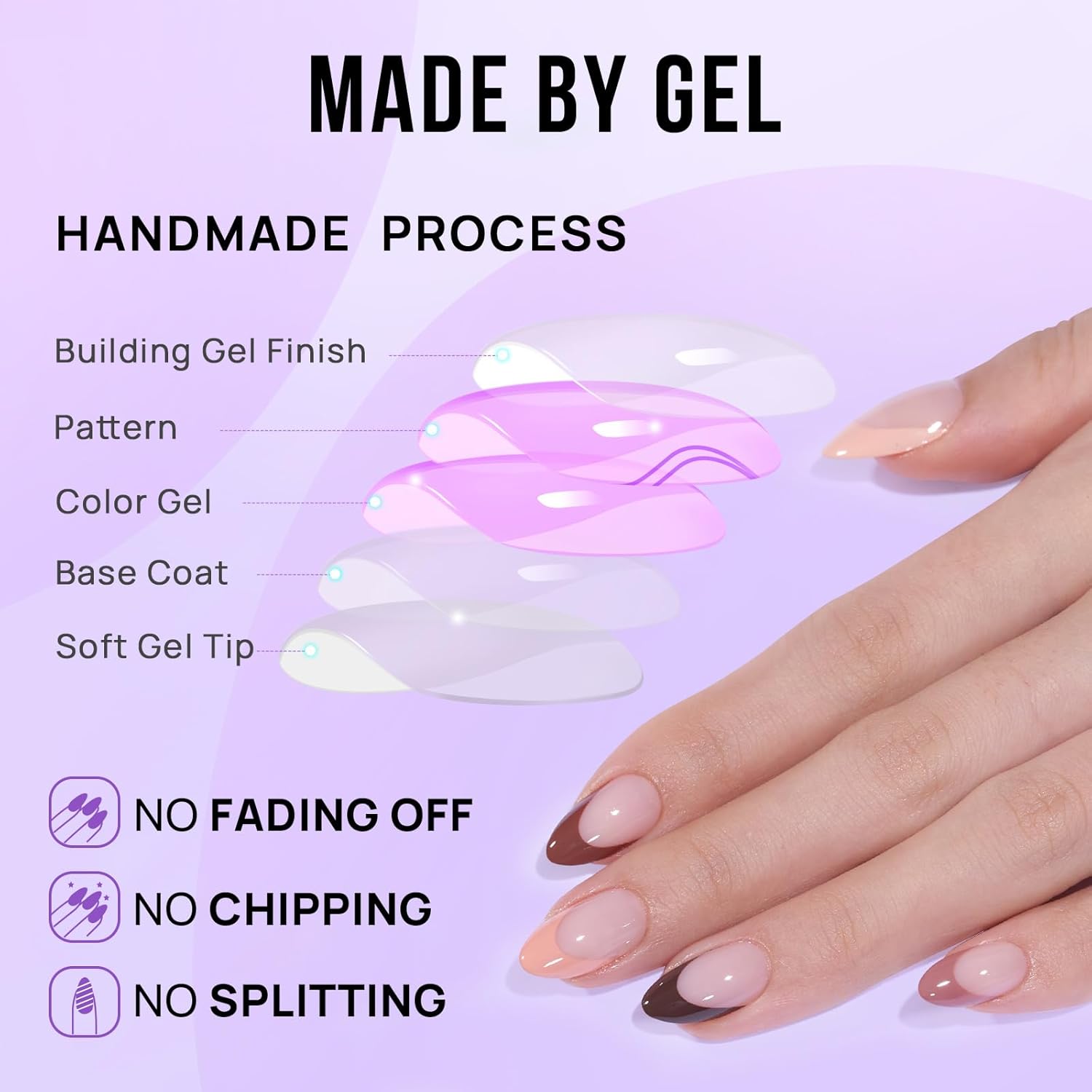- Made by Gel: We made these french tip press on nails completely follow the handmade process(base coat, color gel, pattern, top coat). The color and patterns are made by gel polish instead of printed by ink. Get salon-like nails in 5 mins