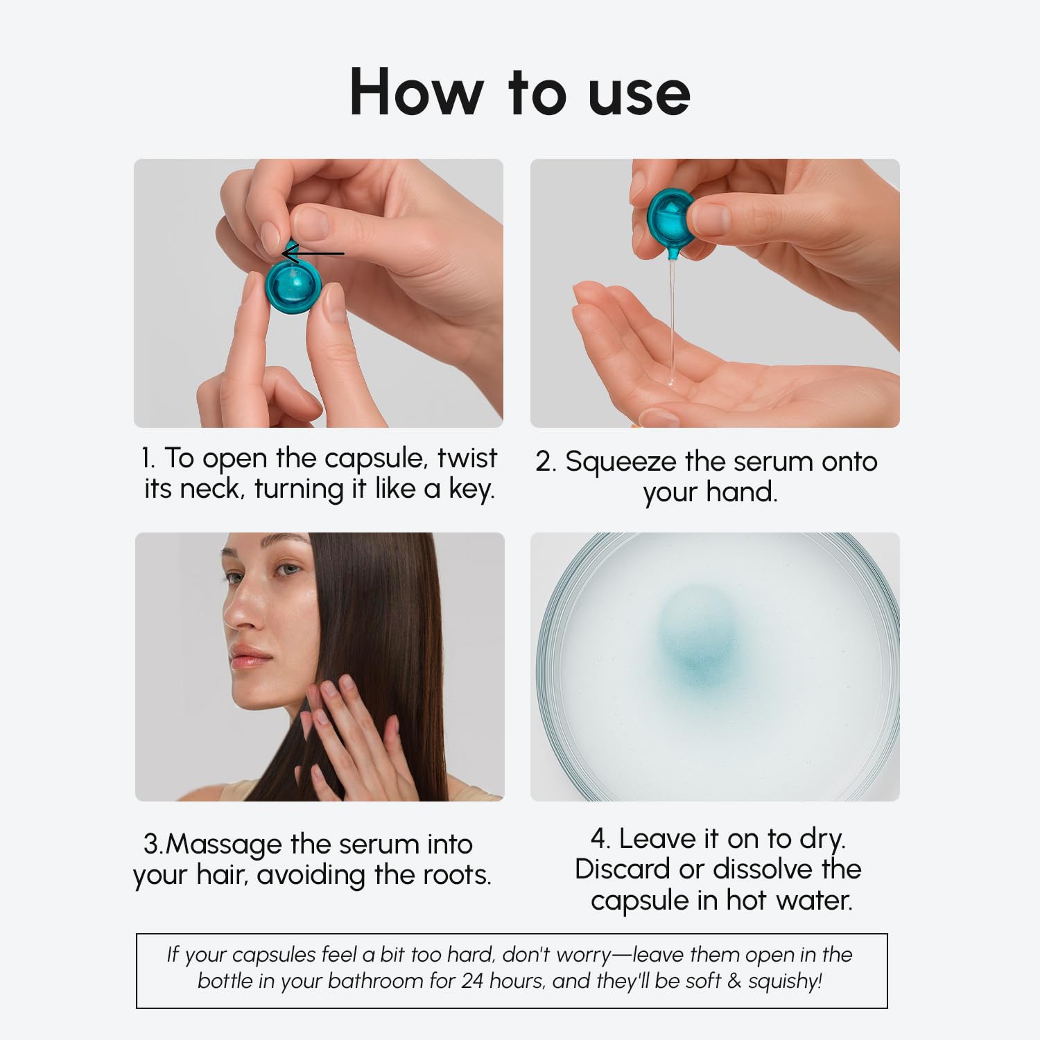 - Easy to Use & Effective Formula – Our oil for hair is safe and effective. It is suitable for all hair types, including curly, bleached, and colored. Each gotas para el cabello delivers the perfect amount of serum without waste. If your capsules feel a bit too hard, don't worry – leave them open in the bottle in your bathroom for 24 hours!