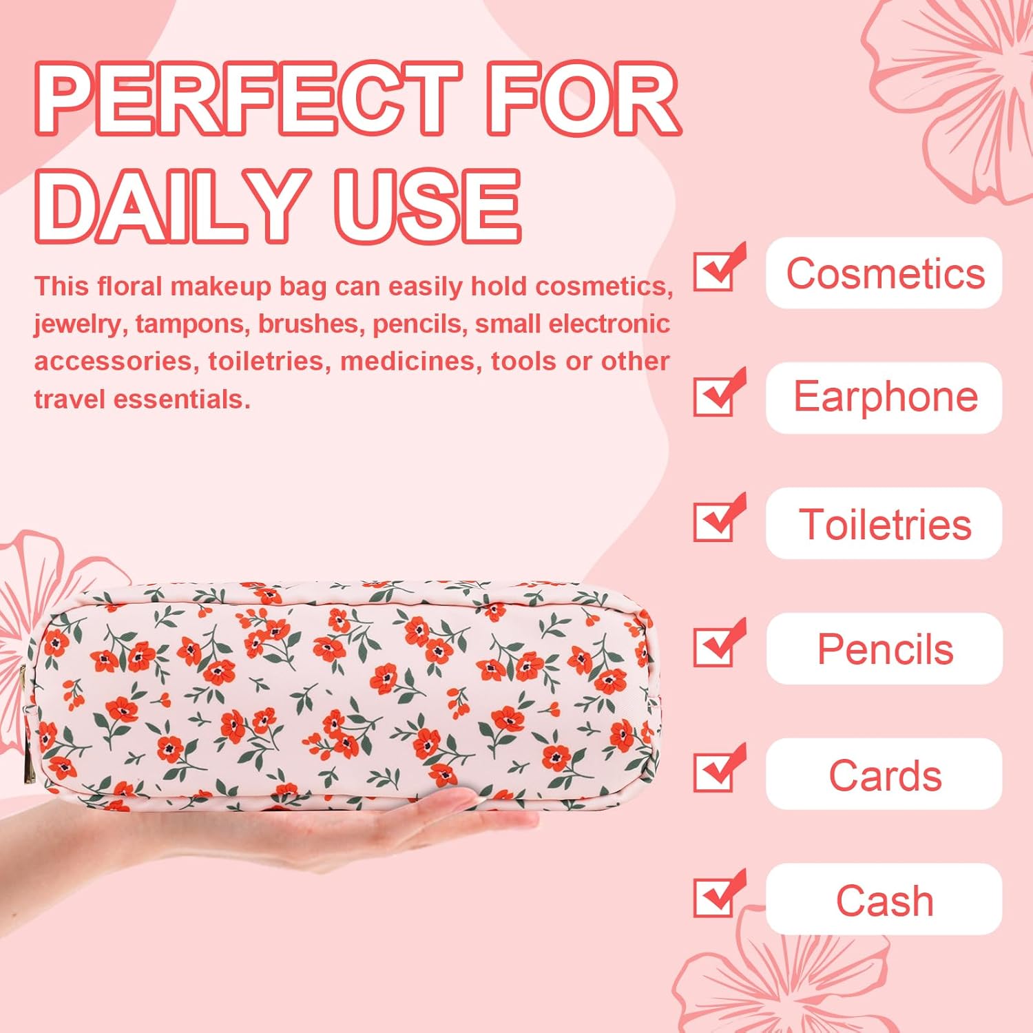 Waterproof Small Floral Pencil Case Makeup Bag for Purse,Cute Flower Pencil Pouch Preppy Nylon Makeup Brush Holder with Zipper,Girls Portable Storage Case Small Pen Bag for Work(Slim Pink-Flowers)