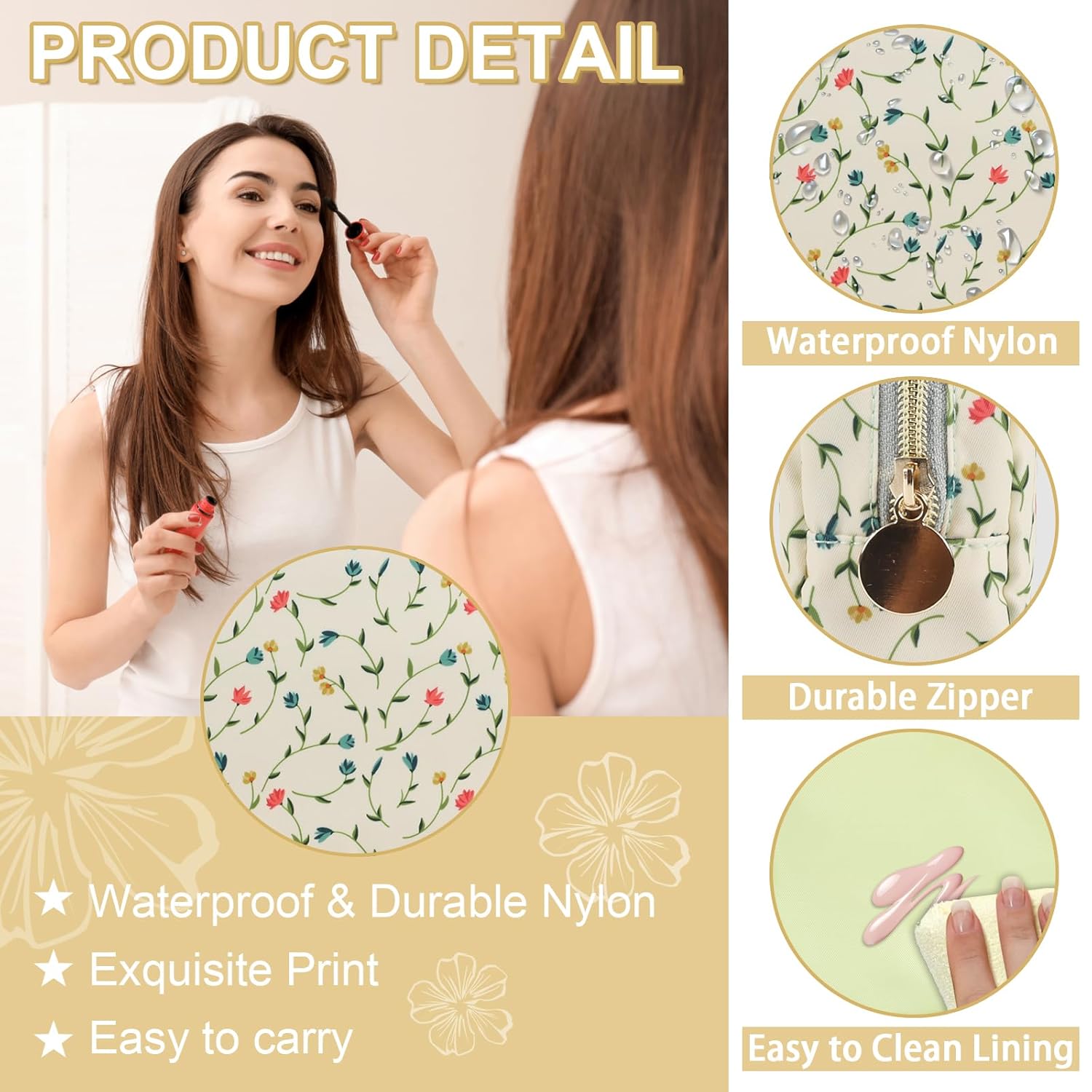 - 【Superior Quality】The floral makeup bag is made of lightweight and durable high quality nylon. It is waterproof and easy to clean, helping to protect your cosmetics and toiletries from water spill accidents.