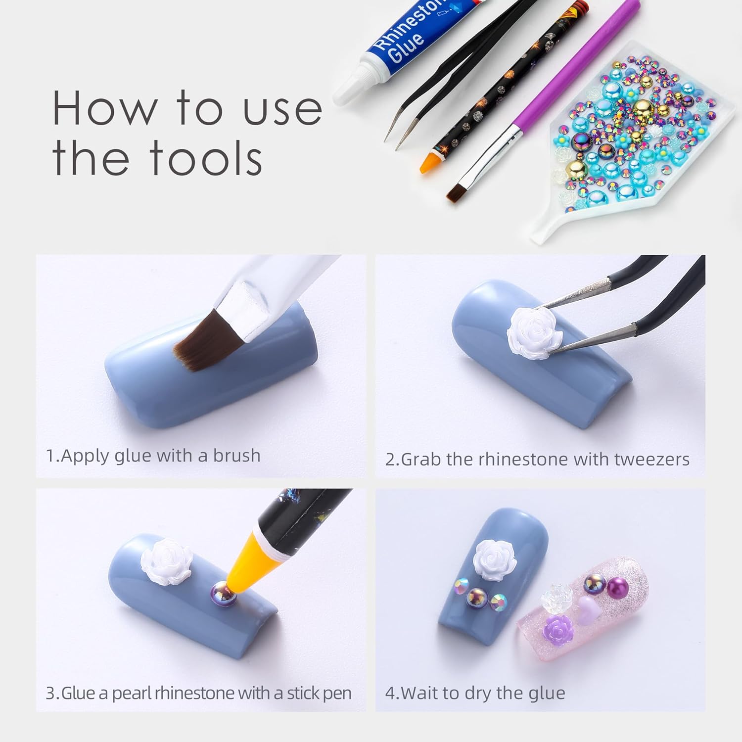 - Useful tools - These pearls and rhinestones have a flat back, which is excellent for easy placement.and you can pick up any large or small pearls and rhinestones with the crayons we bring along. And use the brush to smooth out the Gel, these tools will work very well