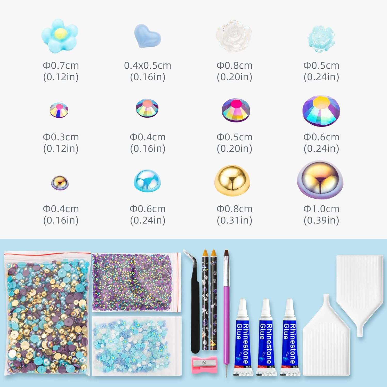 - What You Will Receive: 60g(30g*2)mixed size flat back pearls and rhinestones. 3*Rhinestone Glue. 1* wax pencil for rhinestones. 1*Pencil sharpener(color random). The mix half round pearls and rhinestones can make more beautiful handicrafts for your friends, parents, yourselfs on any festivals.If you need a mixed size pack of pearl rhinestones