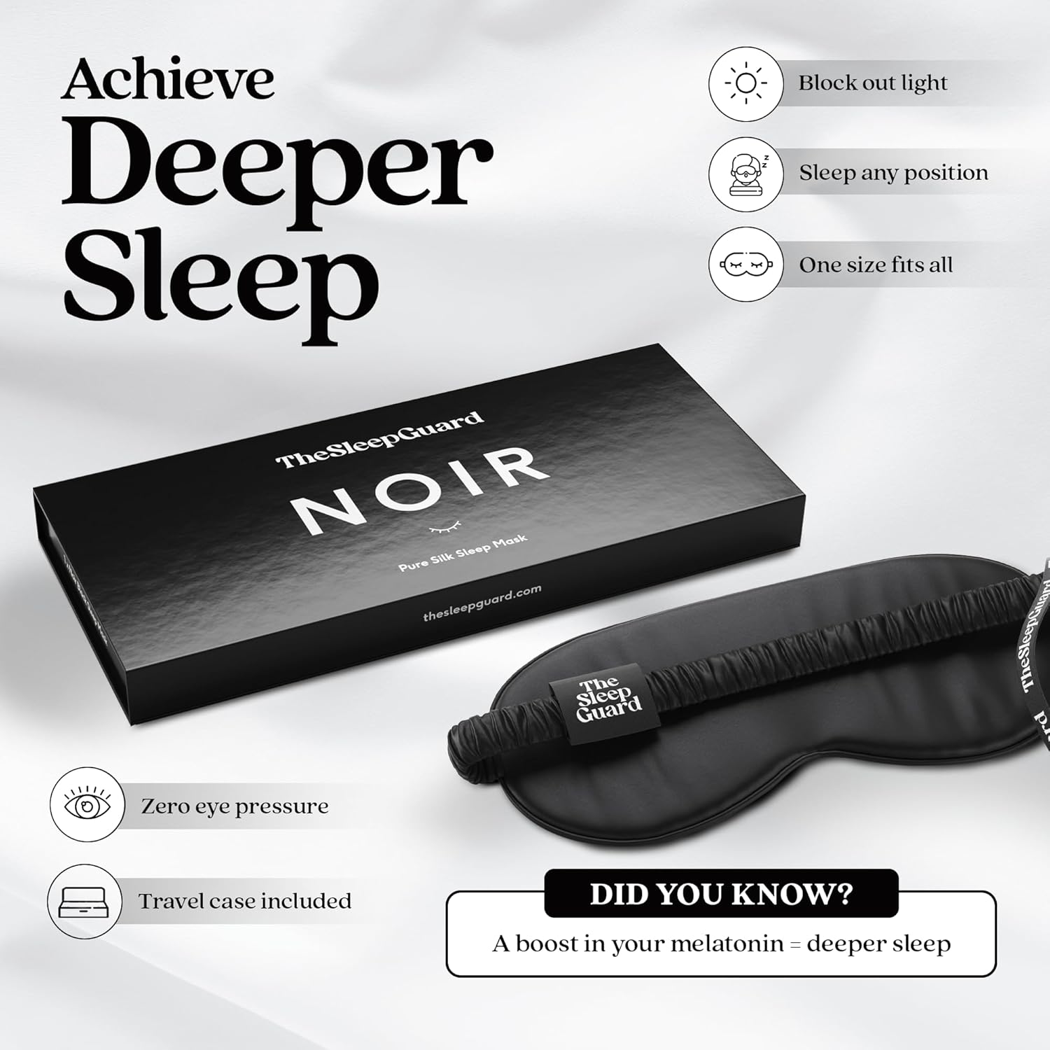 - 🔆 BLOCK OUT LIGHT - Achieve a deeper sleep with our pure silk sleep mask. An eye cover will help you get a better night’s sleep by falling asleep faster and staying asleep longer thanks to a boost in melatonin production.