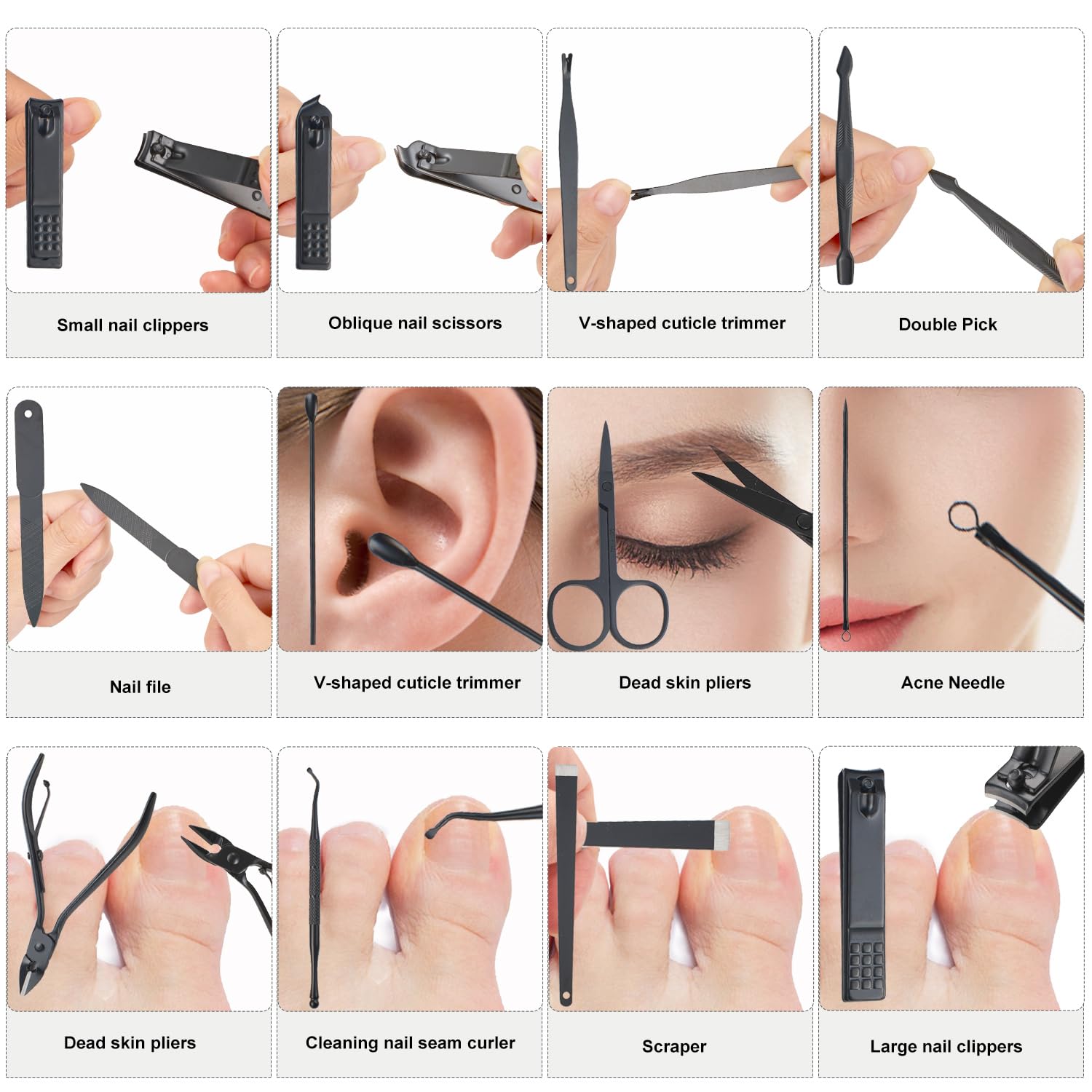 - Manicure Set:manicure and beauty kit contains 12 kinds of care tools for hands and feet,multifunctiona include hand care,facial care,foot care tools,can meet all of you needs, Nail Kit, Manicure Kit, Nail Care Kit For Men.