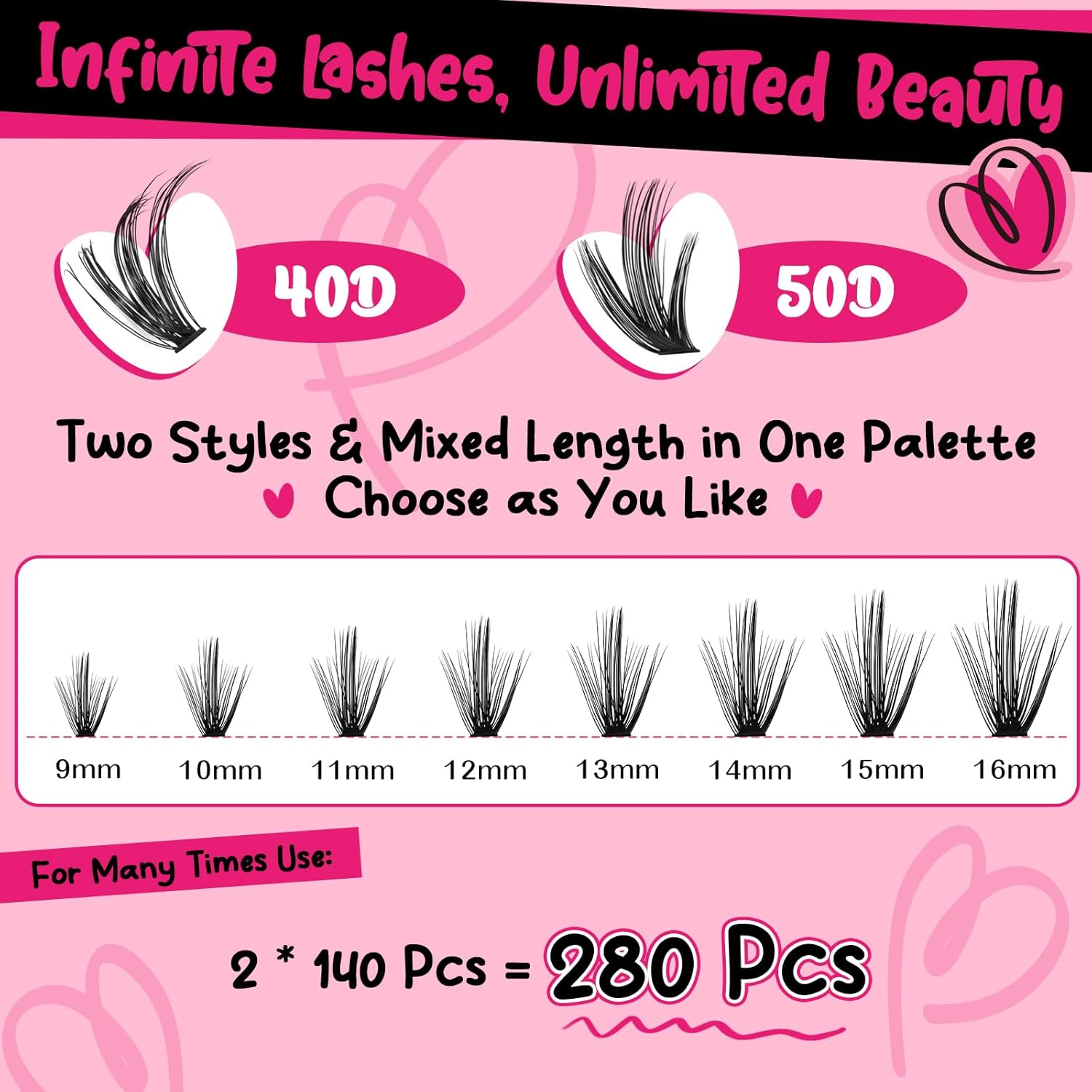 - 280 Individual Lashes: You can provide 280 lashes in one tray! The blended lengths range from 9mm to 16mm,D curl , and there are also have 30D+40D. With a variety of styles for you to choose from.