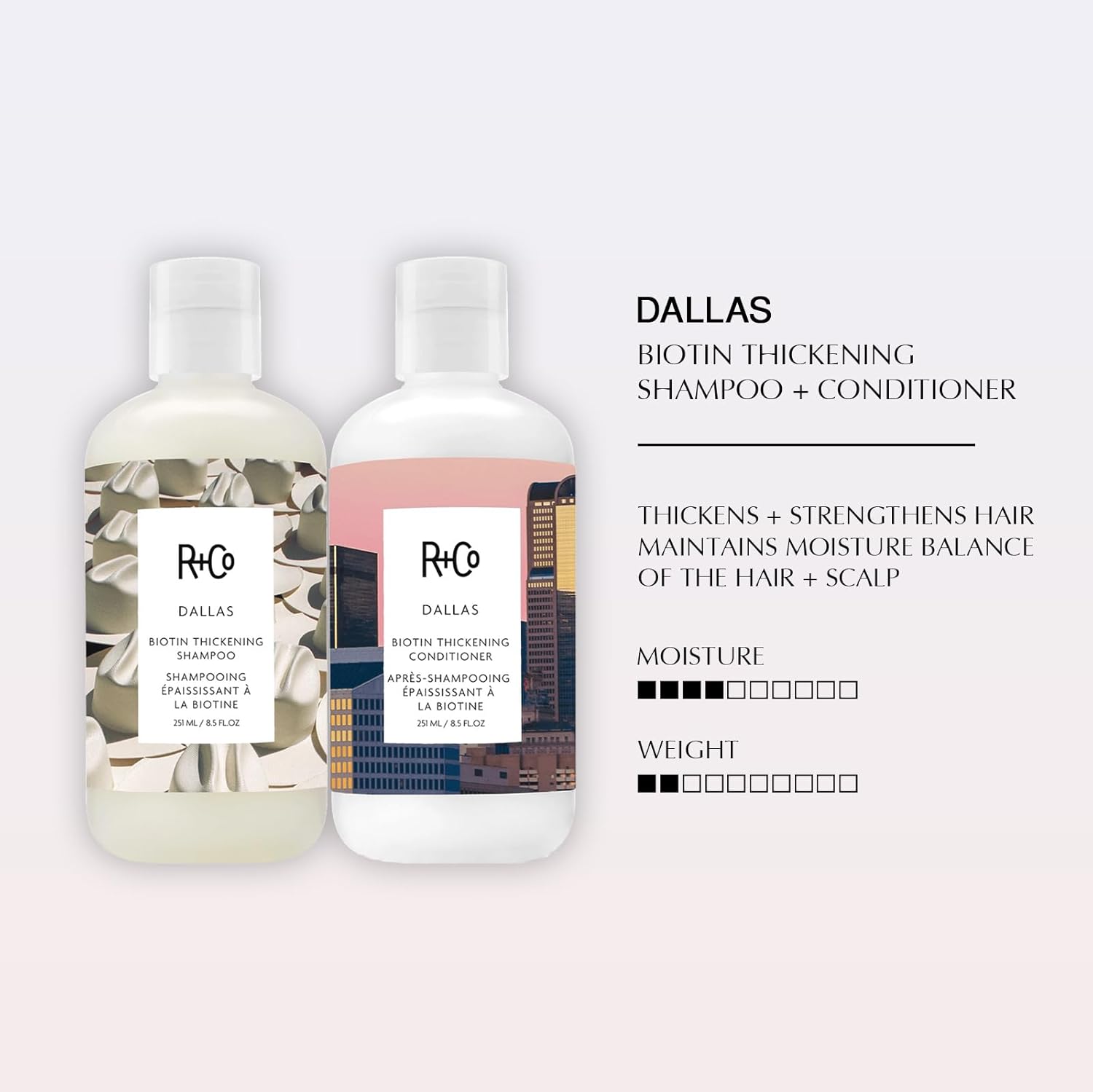 - R+Co Dallas Conditioner: The final step for hair as big as Texas. DALLAS Biotin Thickening Conditioner revitalizes hair with lightweight hydration. Infused with Biotin for prolonged strength and enhanced shine.
