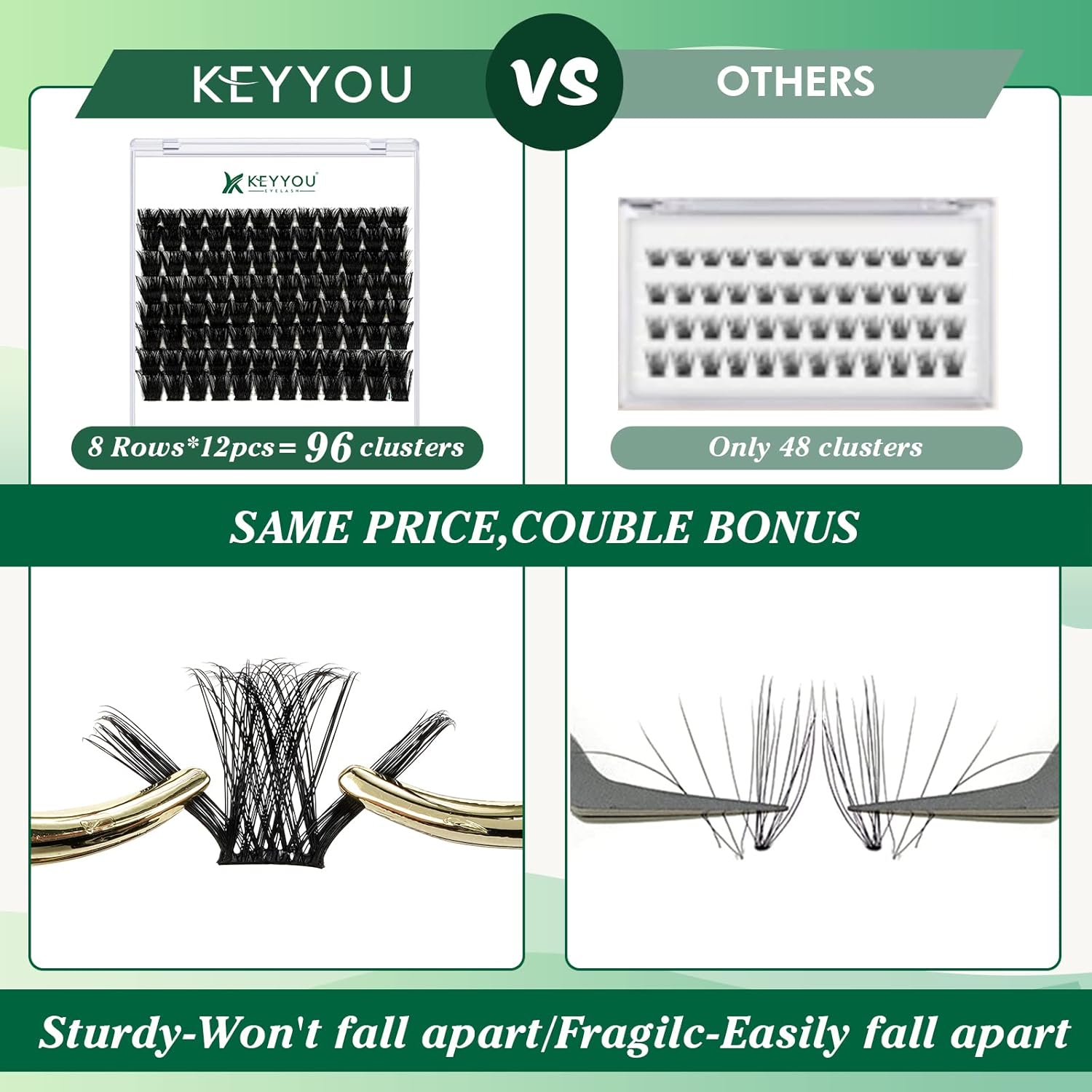 - 【Soft&Comfortable】KEYYOU lash cluster are made of imported materials,the stem line is thinner and softer, the eyelash cluster are lighter and more comfortable to wear.96 clusters in one tray ,more cost-effective.