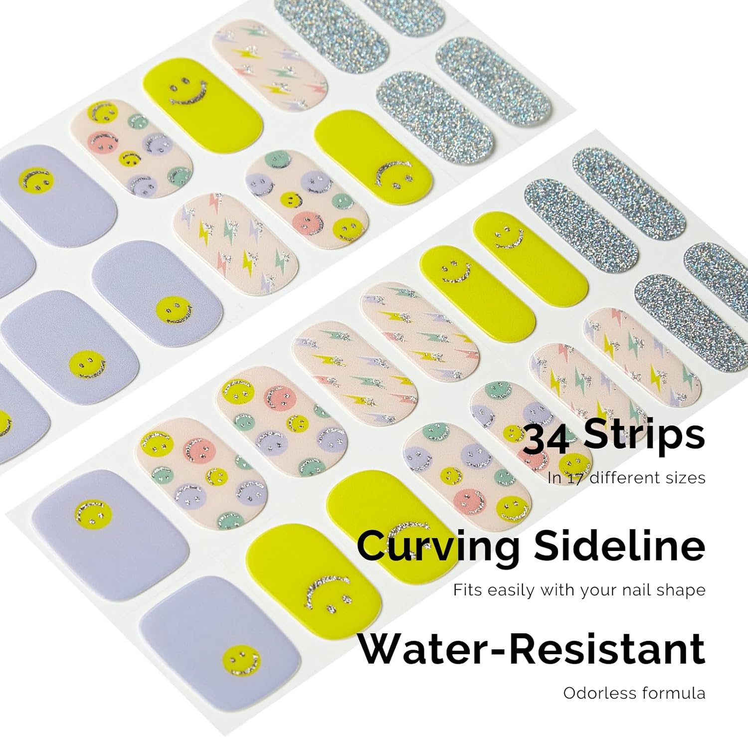 - 【34 PCS NAIL STRIPS】More Quantity & Sizes than Ever! - With 17 different sizes of our nail art stickers, you can easily find the right size to match your nails. - New curved side line fits even better with your nail shape for seamless adhesion.