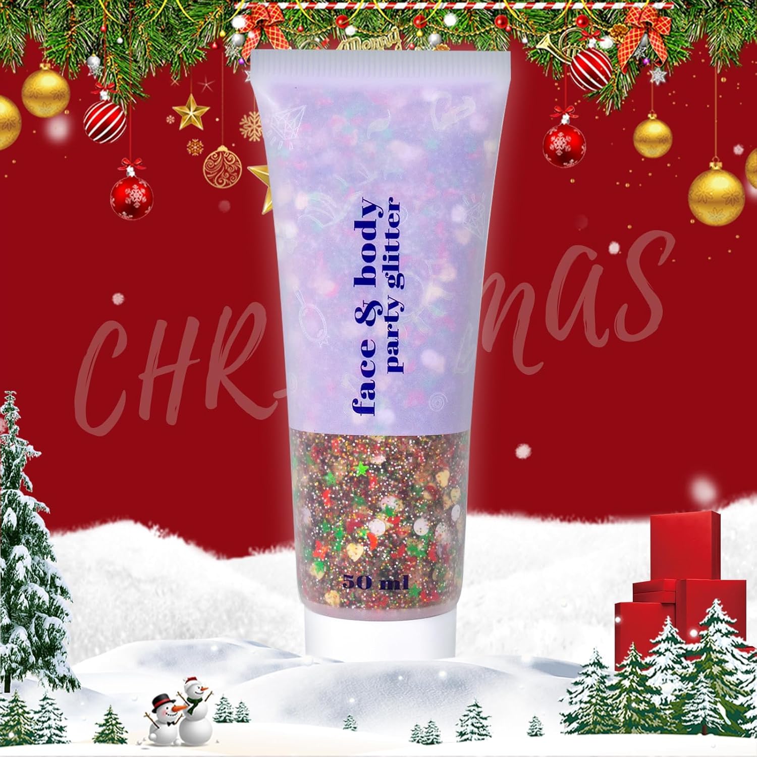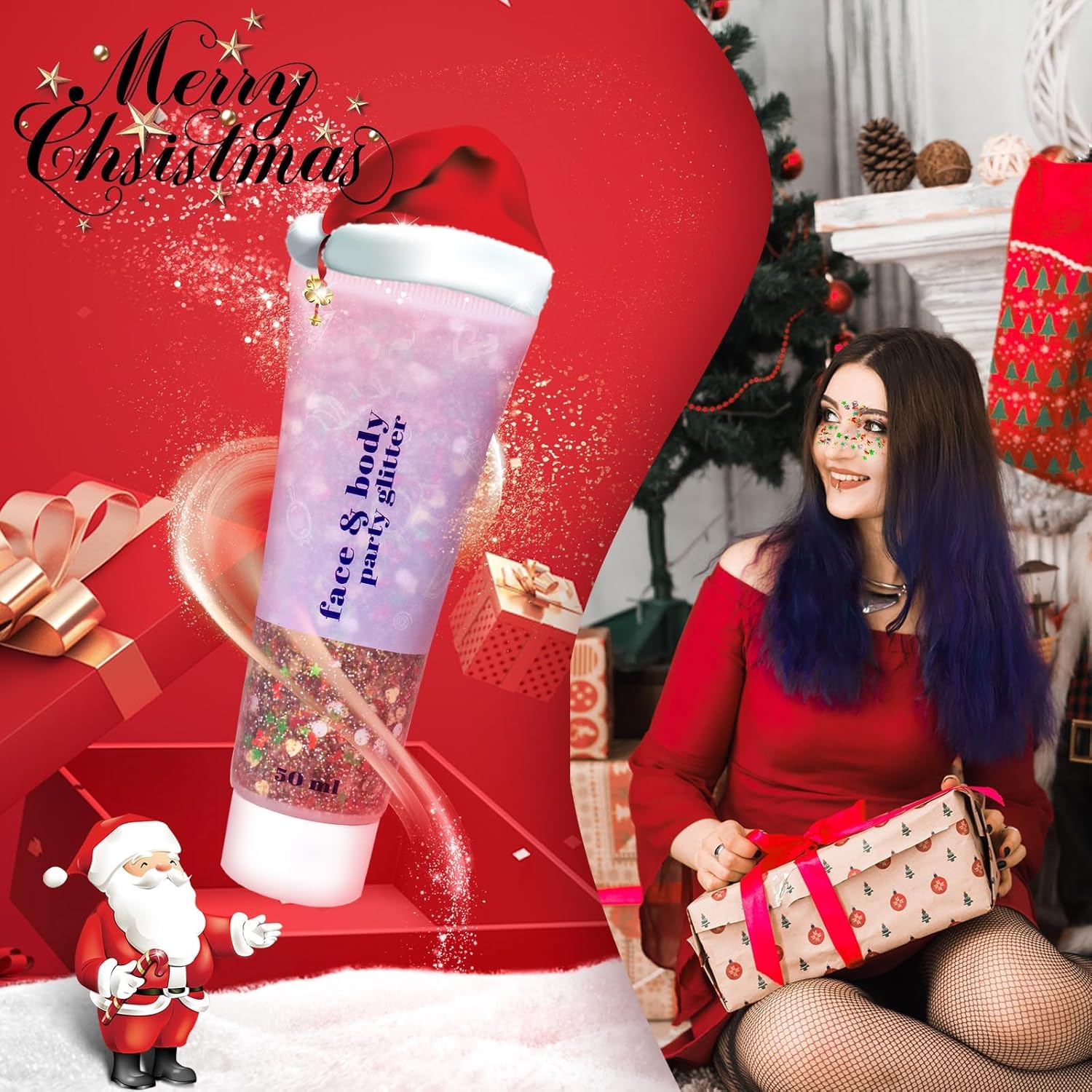 DAGEDA Body Glitter Gel, Face Glitters Body Gel Sequins Shimmer Liquid Eyeshadow, Chunky Glitter for Face Hair, Holographic Cosmetic Laser Powder Festival Glitter Makeup1.7oz (Christmas)