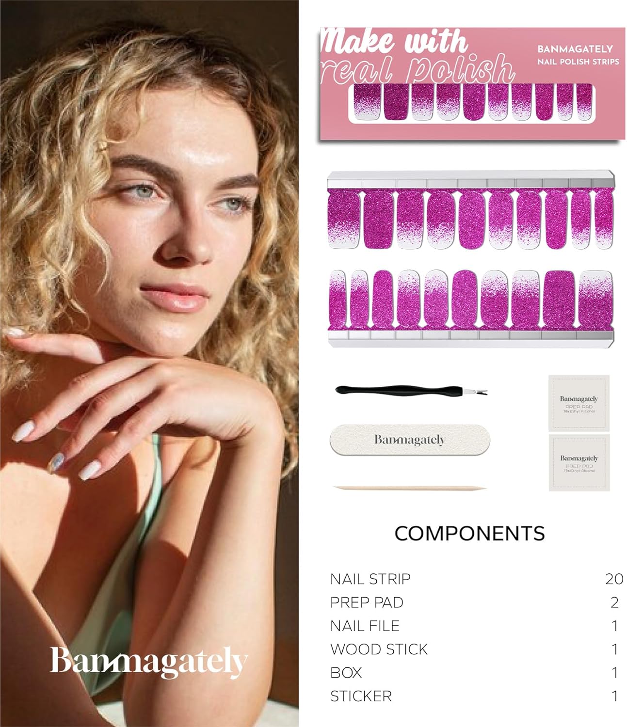 - Package Include: The whole product includes 20 pieces Water resistant Polish Nail Strips , 2 Cleaning Wipes, 1 Wood Stick, 1 Nail File, and 1 instruction manual.