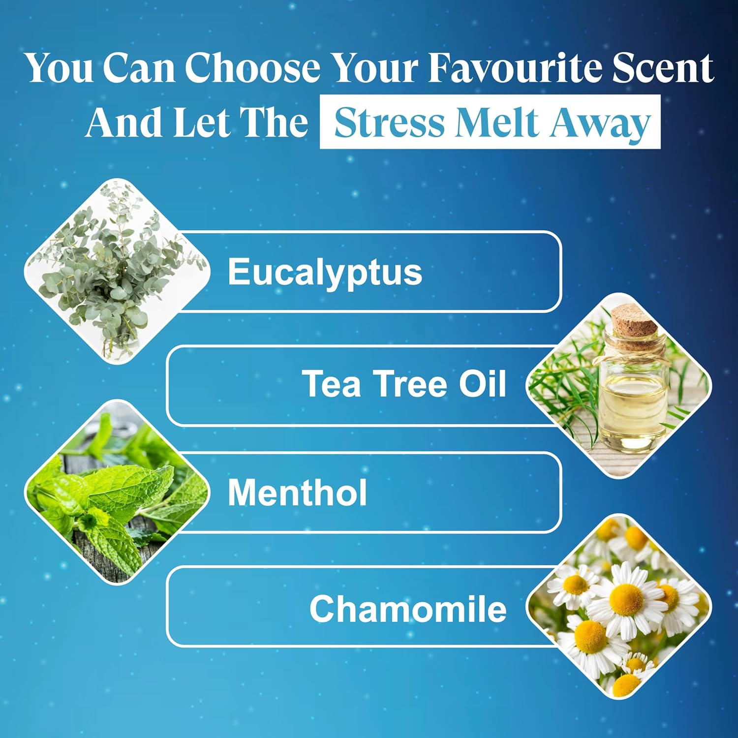 - Scent : Menthol, Chamomile, Tea Tree Oil, and Eucalyptus