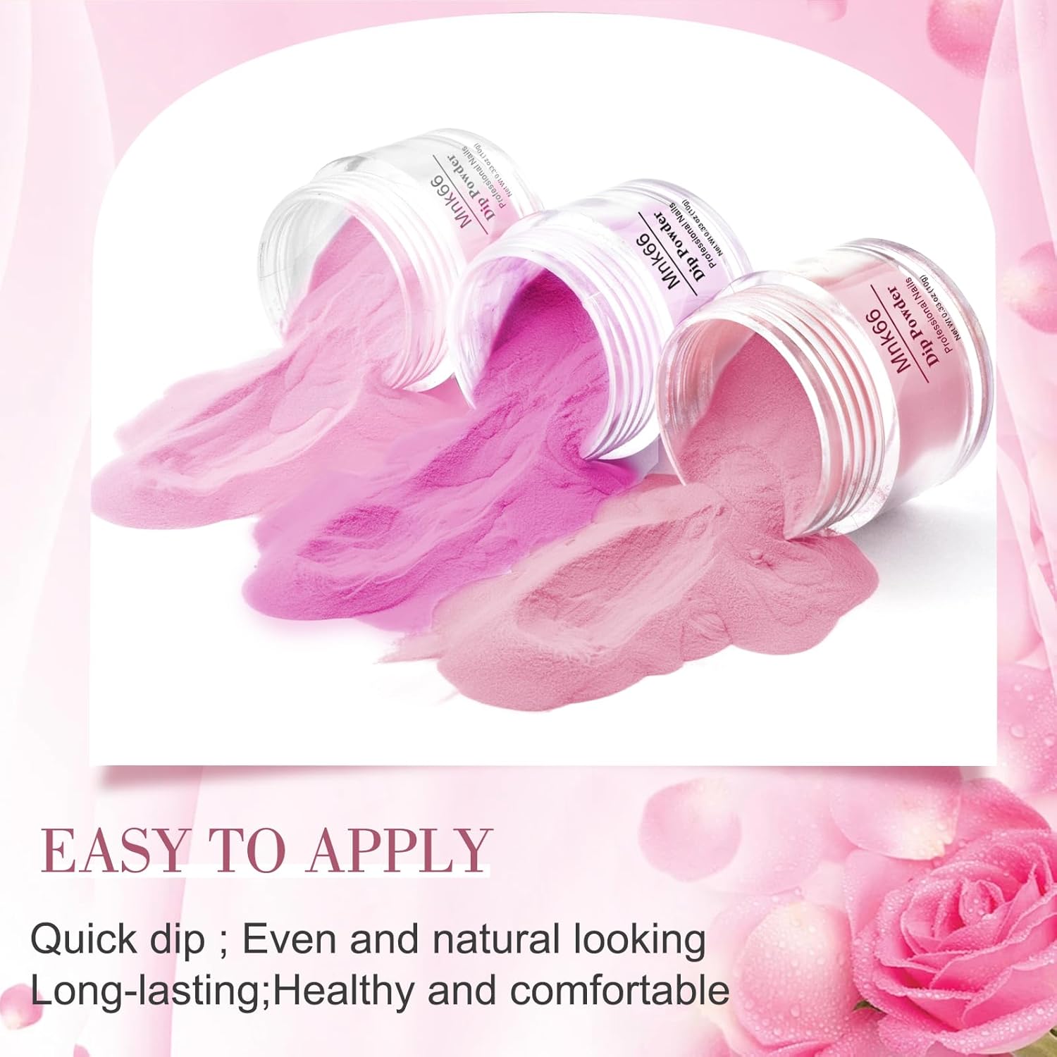 - EASY TO USE - Mnk66 dip powder nail color set doesn't need LED nail lamp to cure, dry faster and skin-friendly, smooth and even with glossy and natural effect. More long-lasting than other regular dip powders. Easy to apply with dip liquid, suitable for beginners and professional nail salons. TIPS - The effection of dip powder will be showing different between 2~3 coating.