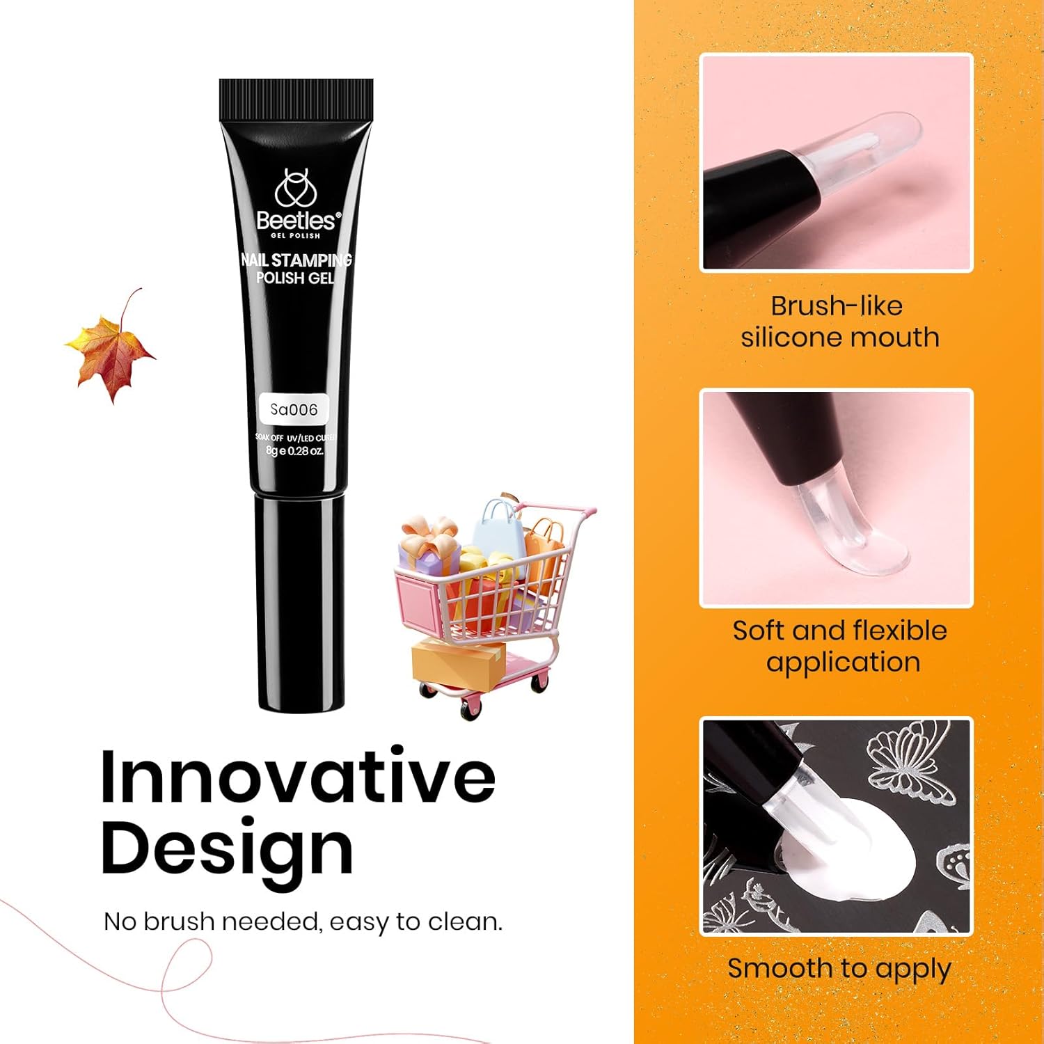 - Beetles Stamp Gel Set: This nail stamp polish gel kit includes nail stamping polish gel 8g*8, Nail stamping template*5, a scraper ,a liquid peel off latex tape 15ml and a short silicone stamper, which is an ideal choice for both beginners and professional nail designers.